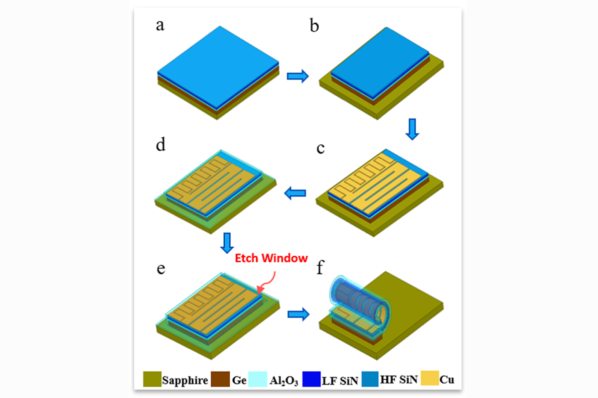 In the lab, the team uses a specialized etching and lithography process to pattern 2D circuitry onto very thin membranes. In the circuit, they join the capacitors and inductors together and with ground or signal lines, all in a single plane. The multilayer membrane can then be rolled into a thin tube and placed onto a chip, the researchers said.