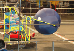 The challenge itself changes from year to year. In the most recent competition during Suchko’s senior year, teams raced their robots around an oval track about the size of a basketball court. Suspended about six feet above the track, and similar to a highway overpass, was a metal rack holding 40-inch diameter balls. Teams were awarded points for completing laps around the track, as well as for knocking balls off of the suspended rack, and then either throwing those balls over the rack or bouncing them underneath it.