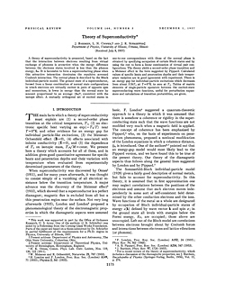 “Theory of Superconductivity” by Bardeen, Cooper, and Schrieffer appeared in the December 1, 1957, issue of Physical Review. The classic paper explained the mysterious loss of electrical resistance in certain metals at extremely low temperatures—a puzzle that for several decades had stumped such physics luminaries as Einstein, Bohr, and Feynman. The BCS theory quickly won acceptance among specialists and still stands today as a pillar of the field of condensed matter physics. For the theory, the 1972 Nobel Prize in Physics went to Bardeen, Cooper, and Schrieffer.