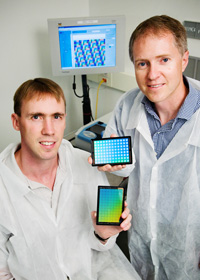 Developed by ECE Associate Professor Brian T Cunningham, the photonic crystal biosensors consist of a low-refractive-index polymer grating coated with a film of high-refractive-index titanium oxide, attached to the bottom of a standard 384-well microplate. Each well functions as a tiny test tube with a biosensor in the bottom.