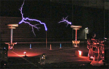 On a nice day, it's not uncommon to see someone picking a guitar on the quad, or even a circle of people pounding away on drums. But two seven-foot Tesla coils spouting bolts of electricity? That's bound to turn some heads. At least that was the experience of Electronic Services Shop Technician Mark Smart when he performed as the headliner for the 2009 annual conference of the Society for Electro-Acoustic Music in the United States (SEAMUS). The conference, held on the campus of Sweetwater Sound in Fort Wayne featured a variety of papers, master classes, and of course, concerts from electronic musicians around the country and the globe.