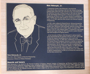 On September 18, 2009, a ceremony was held at the Micro and Nanotechnology Laboratory (MNTL) of the University of Illinois to unveil a plaque honoring the achievements of ECE Professor Nick Holonyak, Jr.