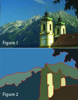 Figure 2 shows the results of the researchers’ success with computer image segmentation. The image illustrates an algorithm of the original image, with each region marked a different color. An ideal segmentation such as this would automatically group the pixels into regions associated with the sky, mountains, tree and building.