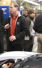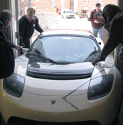 Though classes were not yet in session at the University, the car still drew a crowd. ECE graduate students as well as members of the local electric vehicle club spent more than an hour in some bitter cold weather to look at the vehicle and talk with the drivers from Tesla.