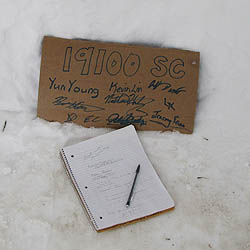 After a long and cold two days, the team completed the longest and trickiest part of construction, closing up the top of the structure, which required patiently packing and reinforcing bricks in a dome like shape. To mark their accomplishment, the team autographed a sign in the igloo reading “19100 SC,” an engineering joke meant to translate to “Igloo Siebel Center.” They also managed to light the inside of the igloo with a multicolored flashlight, giving the structure a deep, blood-red glow. And when the igloo started to attract the attention of passers-by, they left a guest book for visitors to sign and share their thoughts.