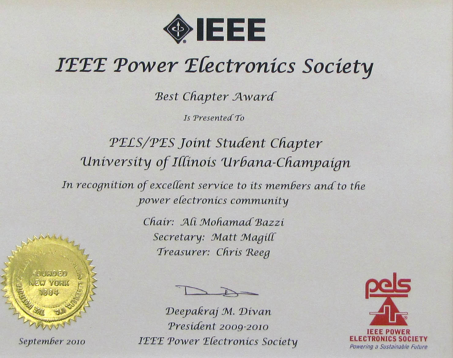 The Illinois IEEE Power Engineering Society and Power Electronics Society (IEEE PES/PELS) Joint Student Chapter was awarded the IEEE Power Electronics Society Best Chapter Award at the 2010 Energy Conversion Congress and Expo in Atlanta this September.