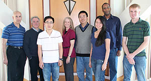 Members of the new Center for Nanostructured Electronic Materials (from left): ECE Professor Joseph Lyding; Gregory Girolami, professor of Chemistry; Wei Ye, graduate student, Materials Science and Engineering; Lisa McElwee-White (principal investigator), University of Florida; David Wei, University of Florida; Noel Chang, graduate student, Chemistry; Marcus Lay, University of Georgia; Justin Mallek, graduate student, Chemistry.