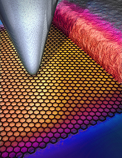 The Illinois team used an atomic force microscope tip as a temperature probe to make the first nanometer-scale temperature measurements of a working graphene transistor. The measurements revealed surprising temperature phenomena at the points where the graphene transistor touches the metal connections. They found that thermoelectric cooling effects can be stronger at graphene contacts than resistive heating, actually lowering the temperature of the transistor.
