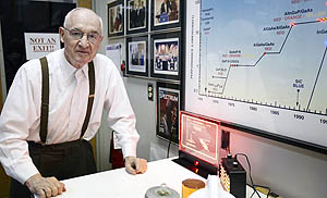 Nick Holonyak Jr. in his office at the Micro and Nanotechnology Laboratory. The chart to the right illustrates the LED's developmental timeline.