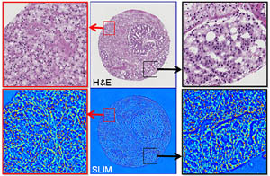 In their paper the researchers wrote that an alternative to the current method in histopathology of evaluating slides of stained tissue biopsies under a microscope is required: “A sensitive and quantitative method for in situ tissue specimen inspection is highly desirable, as it would allow early disease diagnosis and automatic screening.” Using the SLIM method to examine more than 1,200 biopsies, the researchers were able to visualize unstained, or label-free, cells with high-resolution, high-contrast images. The results demonstrated, they wrote, “that quantitative phase imaging of entire unstained biopsies has the potential to fulfill this requirement.