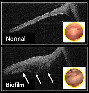 The single scan is performed in a fraction of a second—speed is a necessity for treating squirming tots—and images a few millimeters deep behind the eardrum. Thus, doctors can see not only the presence of a biofilm, but also how thick it is and its position against the eardrum.