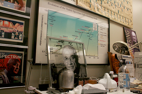 The office of Professor Nick Holonyak, Jr, inventor of the first practical visible-spectrum LED, is quiet. Papers are no longer stacked pell-mell on the desktops as students and colleagues remember (“the infinite piles,” Holonyak called them, because they never disappeared). Instead, the desks are clean and tidy, as though company is expected. But for the first period of time in fifty years as a faculty member at the university, Holonyak, who announced his retirement, effective July 31, is not planning to receive those visitors.