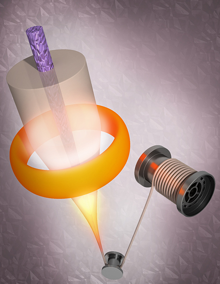 To expand the materials palette, Ballato’s fabrication team at Clemson has created fibers using a molten core approach. With this method, a thin rod of the desired core material is slid inside of the silica tube, instead of injecting gases. When this is heated in the draw tower, the core melts, dissolving and fusing with the inside of the silica tube. In the resulting fiber, a silica cladding surrounds the unique core material. By controlling this process, in terms of how much of the cladding is dissolved, the temperature, and the amount of time for which heat is applied, optical characteristics, previously unachievable, are possible.