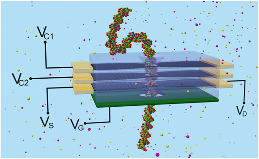 "We knew we could do things differently than by using biological membranes to sequence DNA," Leburton said. "With semiconductor nanotechnology, we could fabricate a membrane with several electrically active layers, and assign a different function to each layer, so that translocating DNA would be efficiently controlled and detected with different electrodes."