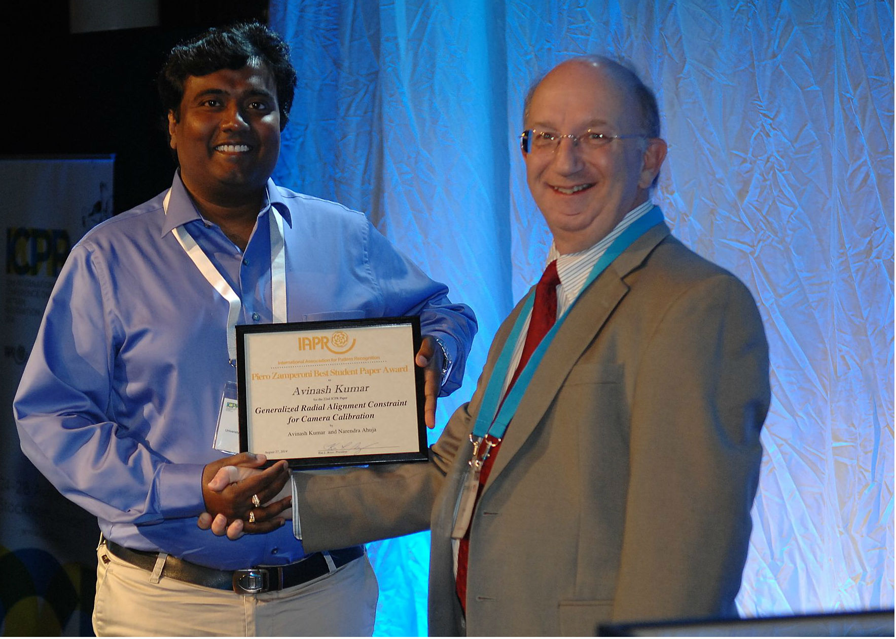 Kumar won the award for his paper titled Generalized Radial Alignment Constraint for Camera Calibration. The paper addresses the problem of camera calibration, a well-researched topic in computer vision where the goal is to estimate the geometric parameters of a camera.