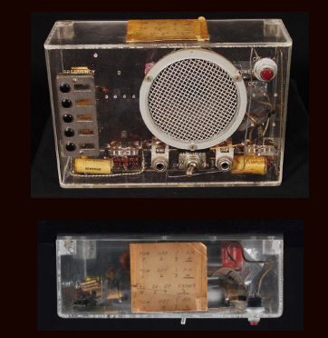 Although the box looks like a radio, it is not. It is a musical instrument. On the left is a vertical row of five black buttons, each of which produces a different tone when pushed. Thus, a simple song can be played on the box. Two of the early cylindrical point-contact transistors were installed toward the front of the case, one on each side of the speaker, so they could easily be seen. Each is labeled on the box, as well.