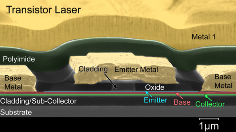 Feng’s group has demonstrated a transistor laser with a fast (30ps) recombination lifetime and modulated optical output with a 22 Gb/s error-free transmission. By incorporating multiple quantum wells and reflectors and even coupling them with quantum dot regions, Feng is optimistic about reducing the recombination lifetime to 5ps.