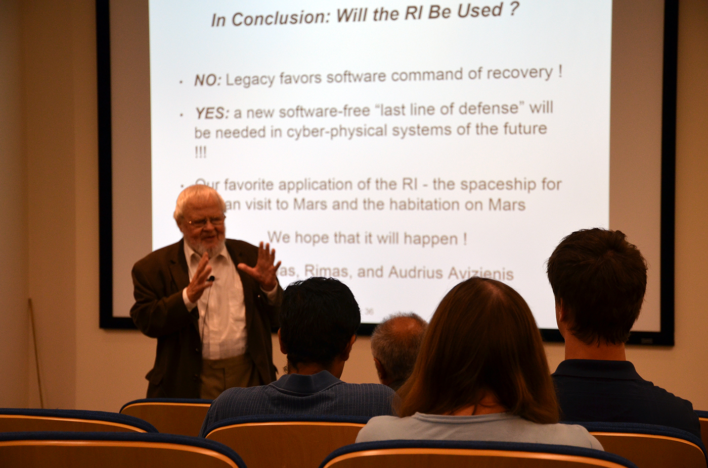 Alumnus and Professor Algirdas Avizienis (BSEE '54, MSEE '55, PhD '60) presented a guest lecture, "Software-free resilience infrastructure for cyber-physical systems."