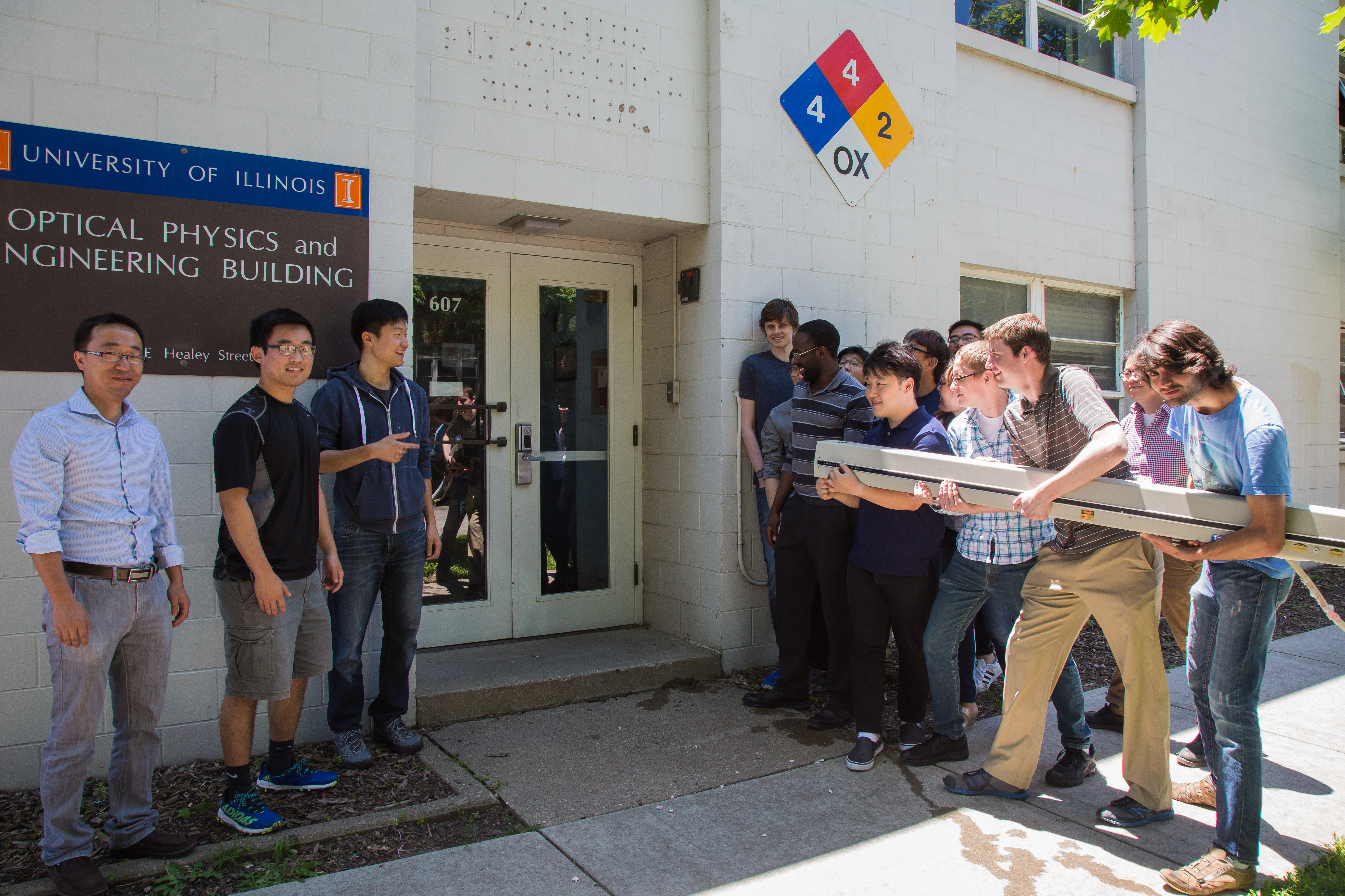 Optical Physics students have fun with a laser and pretend to burn the old lab downThe LOPE (Laboratory for Optical Physics and Engineering) completed its move to the new ECE Building this year. Known originally as the Gaseous Electronics Laboratory, the laboratory was established by Prof. Ladislas Goldstein in the early 1950s and was originally located in the Electrical Engineering Research Laboratory that was situated behind Engineering Hall. In 1964, the Laboratory moved to 607 East Healey Street (just across Wright St. from the previous home of ECE in the Everitt Laboratory). In 2014, the Laboratory celebrated its 50th anniversary at the Healey Street location, and so the move to the new location on north Wright St. was one of mixed emotions for ECE Professor James Gary Eden, current director of LOPE. The occasion was commemorated with fun pictures by Prof. Eden and his graduate students as they bade farewell to the old lab building. While the move began with the inauguration of the new ECE Building in 2014, it took almost 2 years to complete due to the enormous amount of equipment and materials that had to be moved. Multiple laser systems, including one capable of producing light pulses of 20 femtoseconds, vacuum equipment and spectrometers, and sophisticated dye-lasers that can produce high intensity pulses of several nanoseconds in length, are only a few of the many instruments not available elsewhere on campus. The new lab features over $1M of new equipment, courtesy of the Department of Defense.