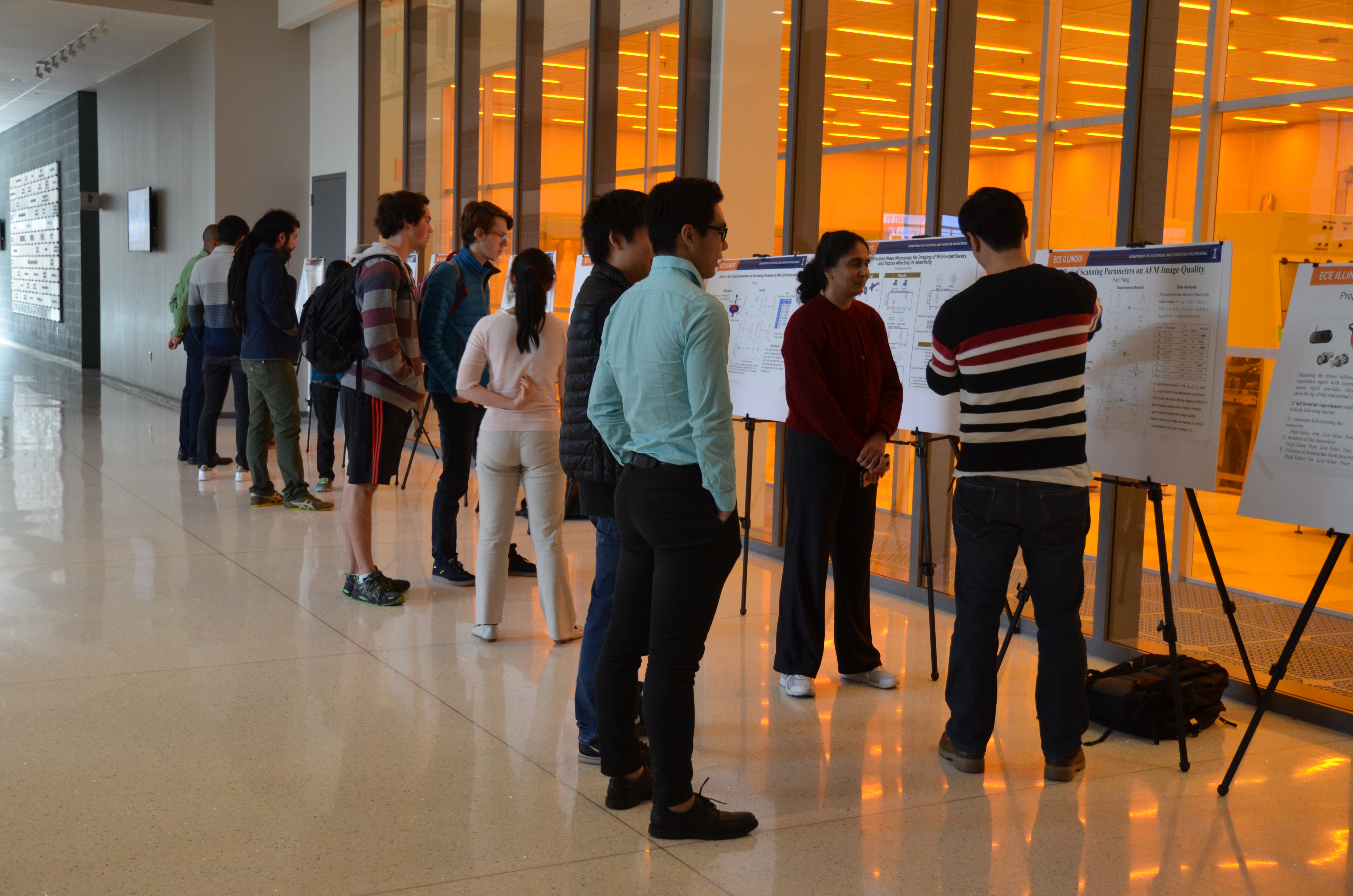 Several passersby are intrigued by Aerospace Engineering graduate student Fan Yang's poster on the 'Effect of Scanning Parameters on AFM Image Quality'.