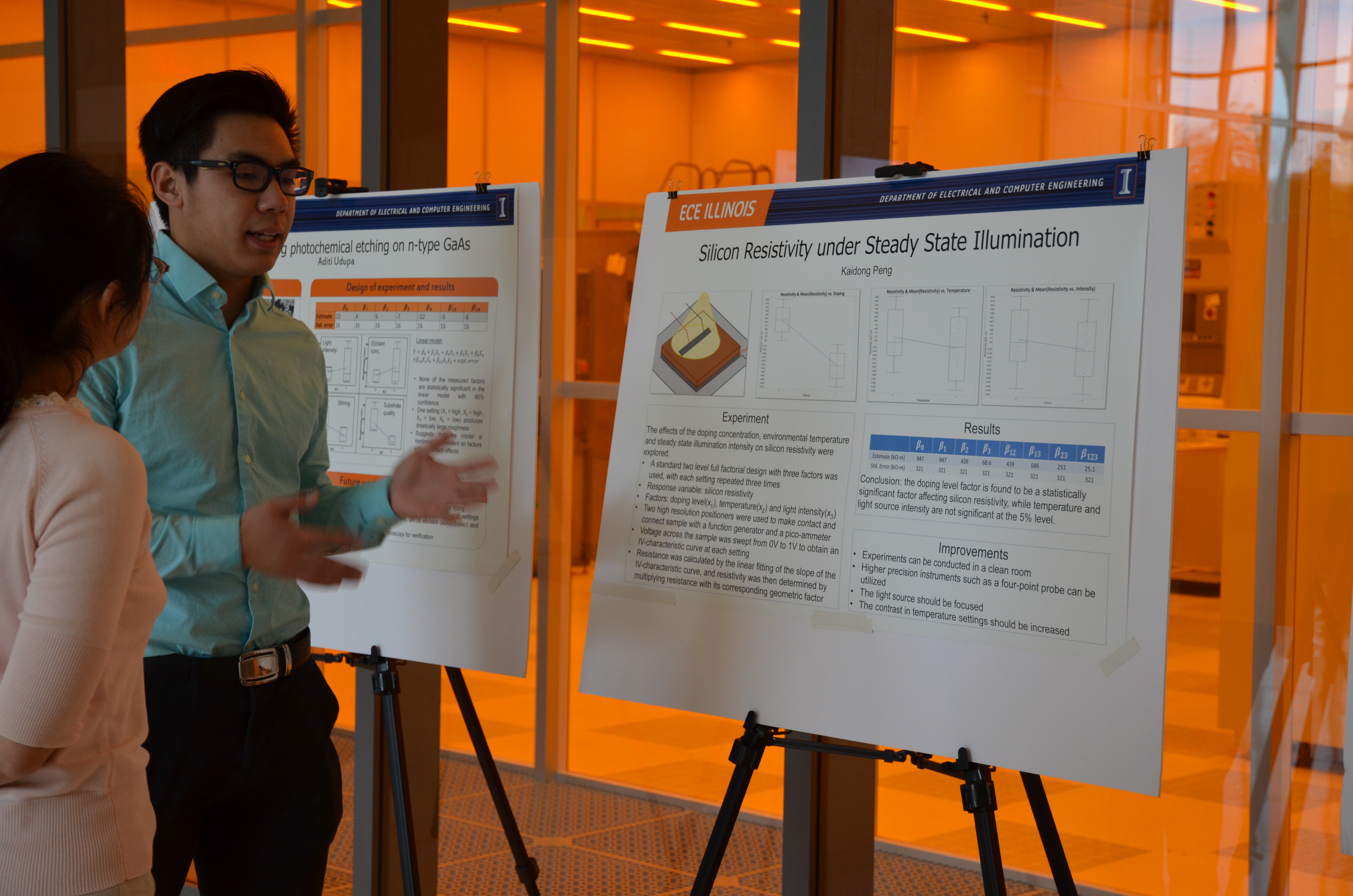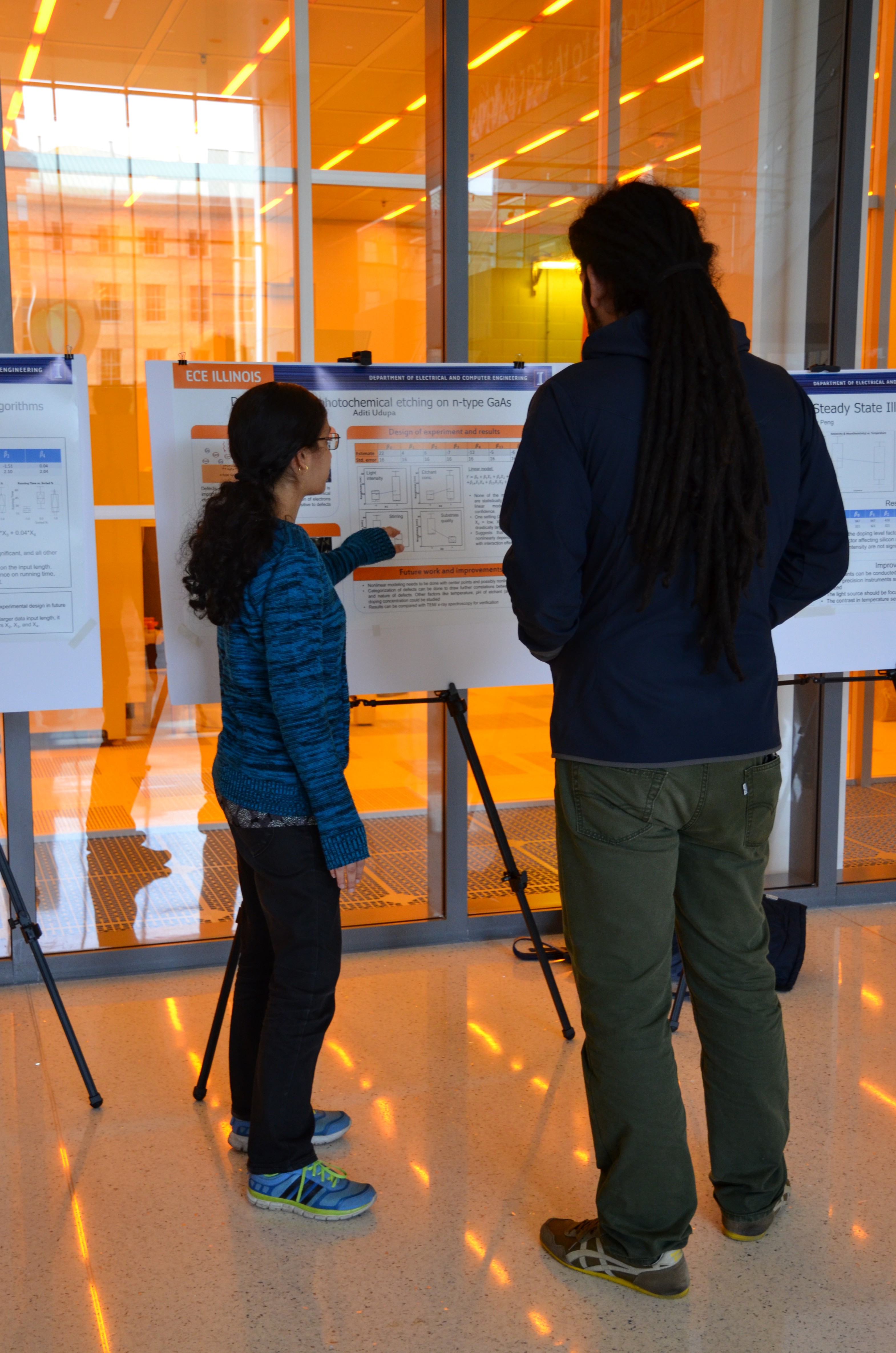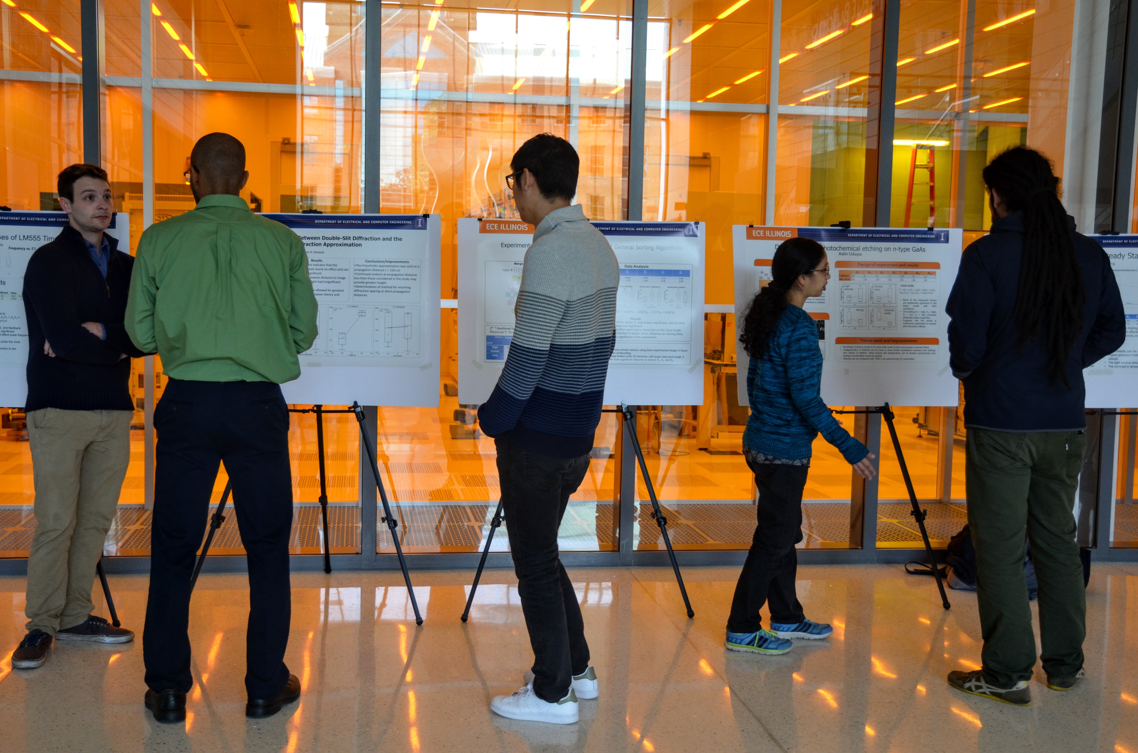 On Wednesday, November 9, students from ECE 446: Principles of Experimental Research shared their independent projects in a poster session held in the ECEB atrium. The class, taught by Professor Lynford L Goddard, is an undergraduate lab elective as well as an MEng professional development class. The students' papers are available as a compiled PDF.