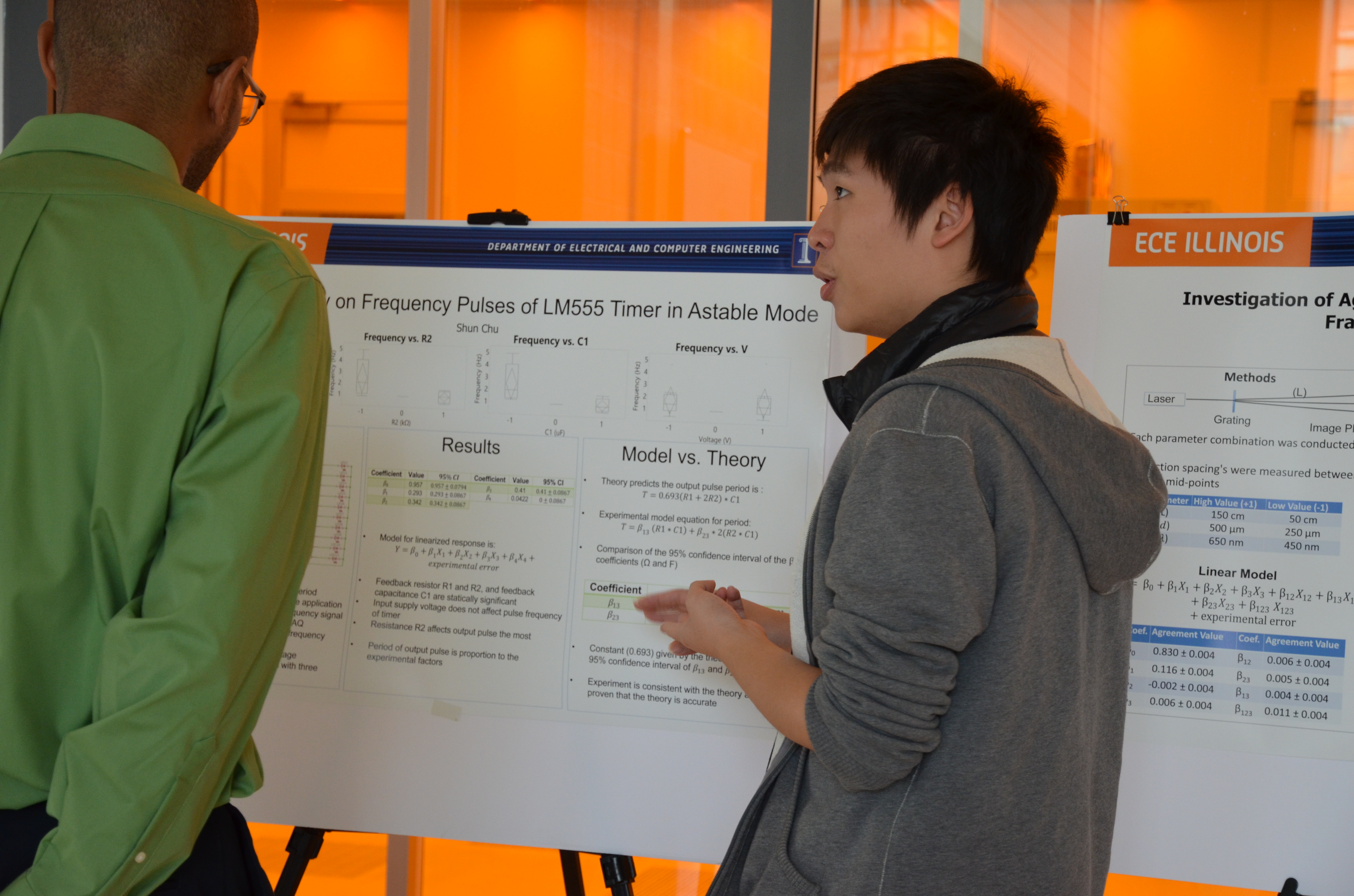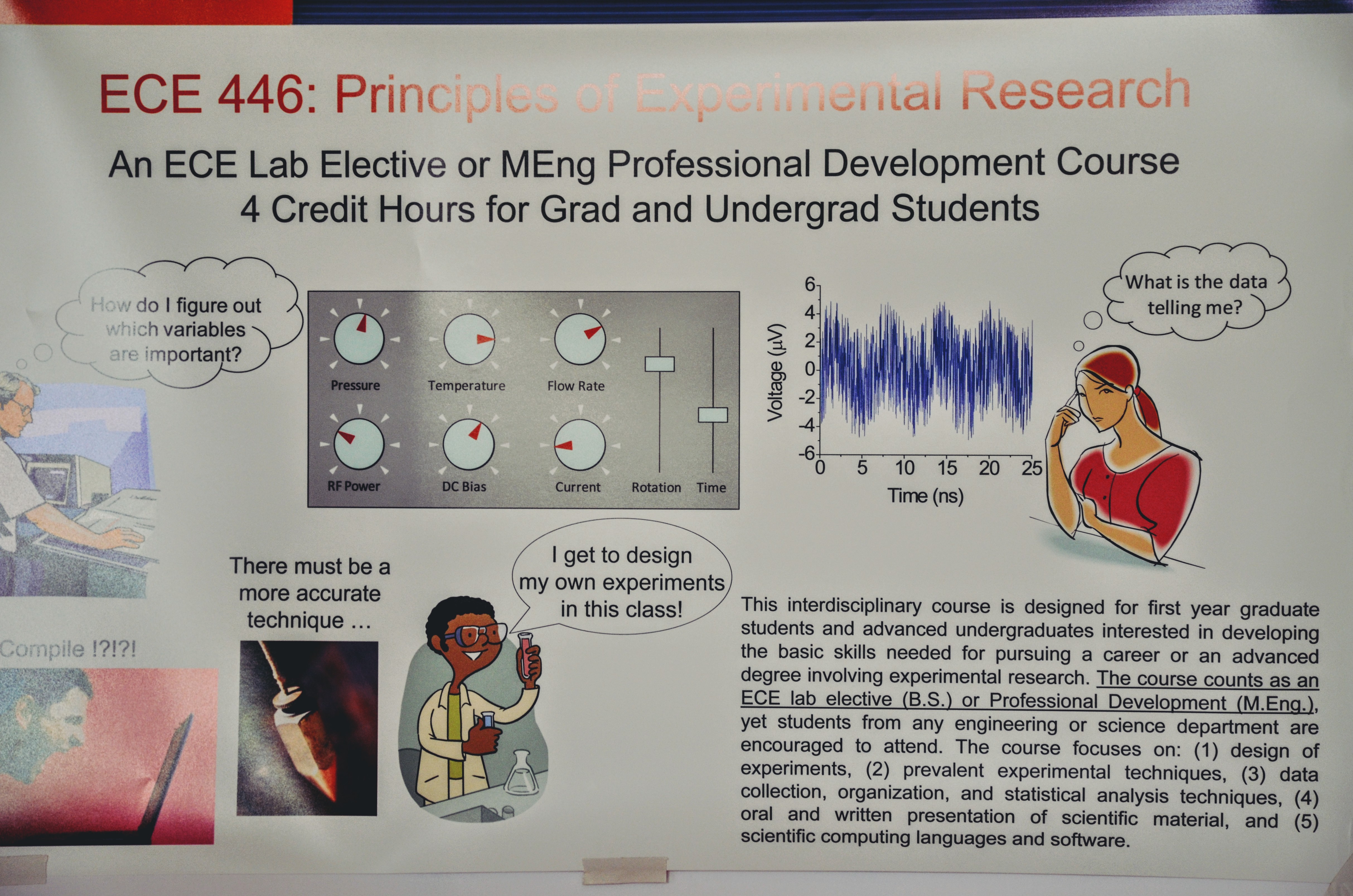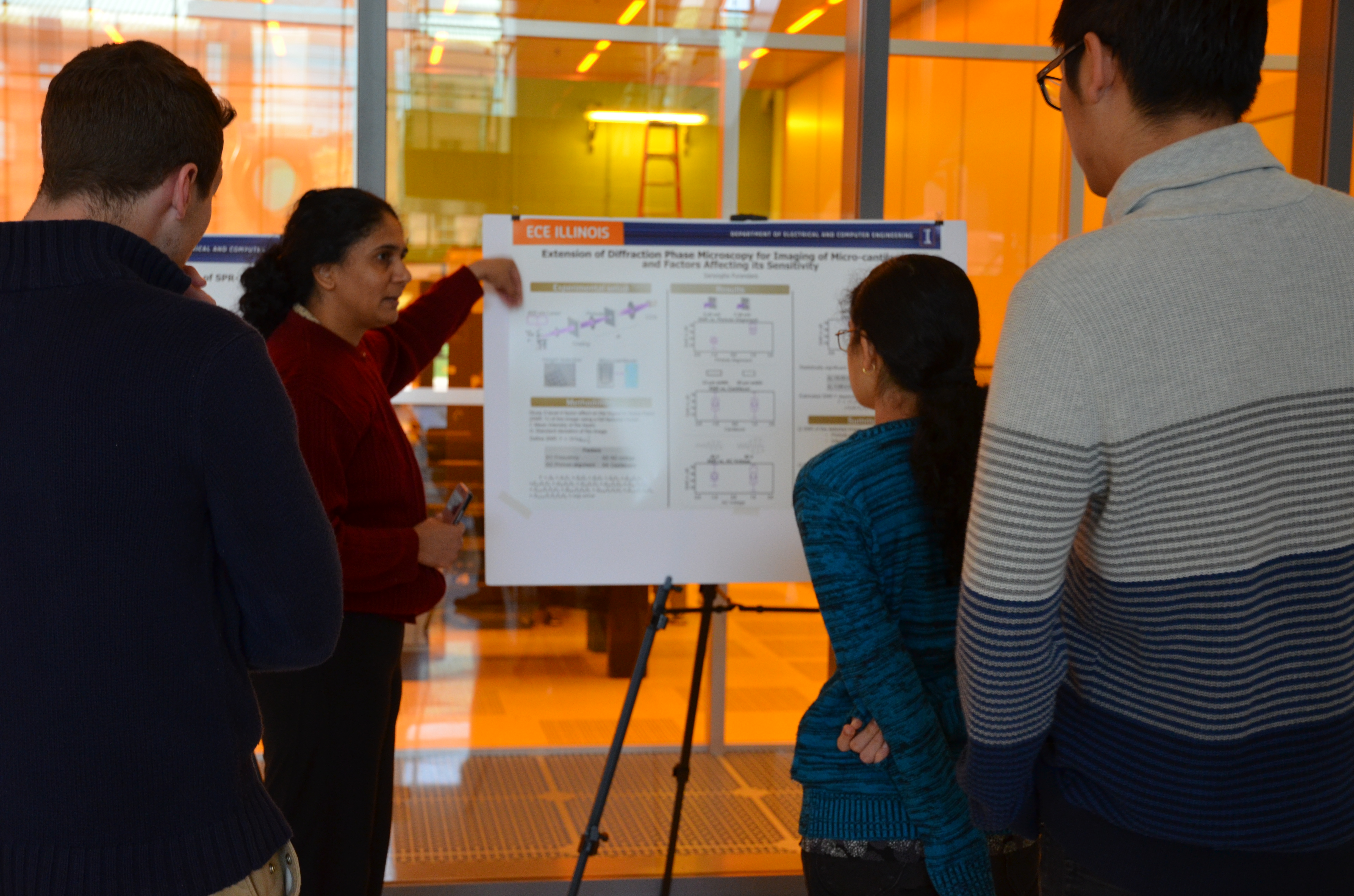 On Wednesday, November 9, students from ECE 446: Principles of Experimental Research shared their independent projects in a poster session held in the ECEB atrium. The class, taught by Professor Lynford L Goddard, is an undergraduate lab elective as well as an MEng professional development class. The students' papers are available as a compiled PDF.