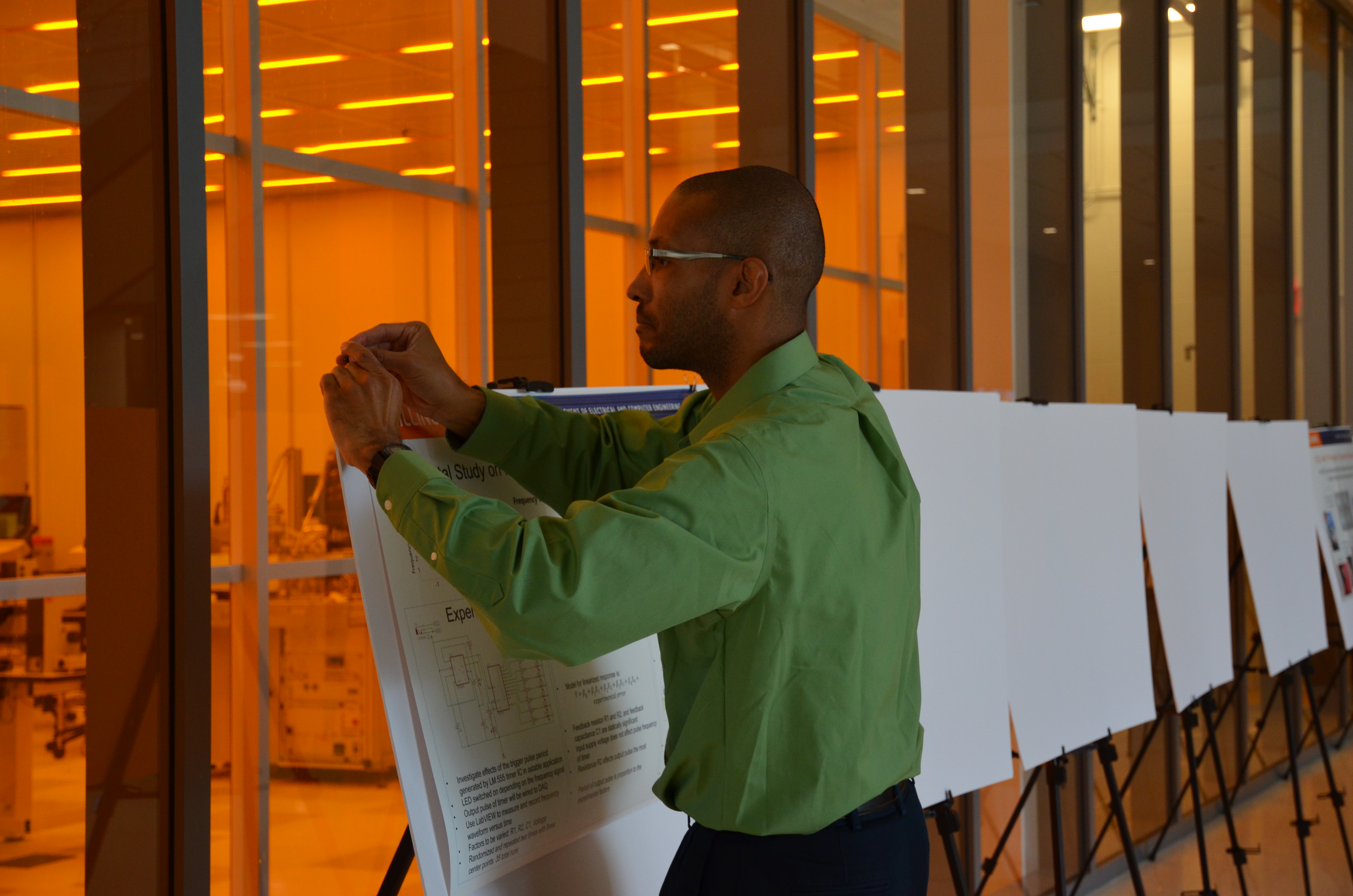 Graduate student Shun Chu puts forth a poster on 'Experimental Study on Frequency Pulses of LM 555 Timer in Astable Mode'.