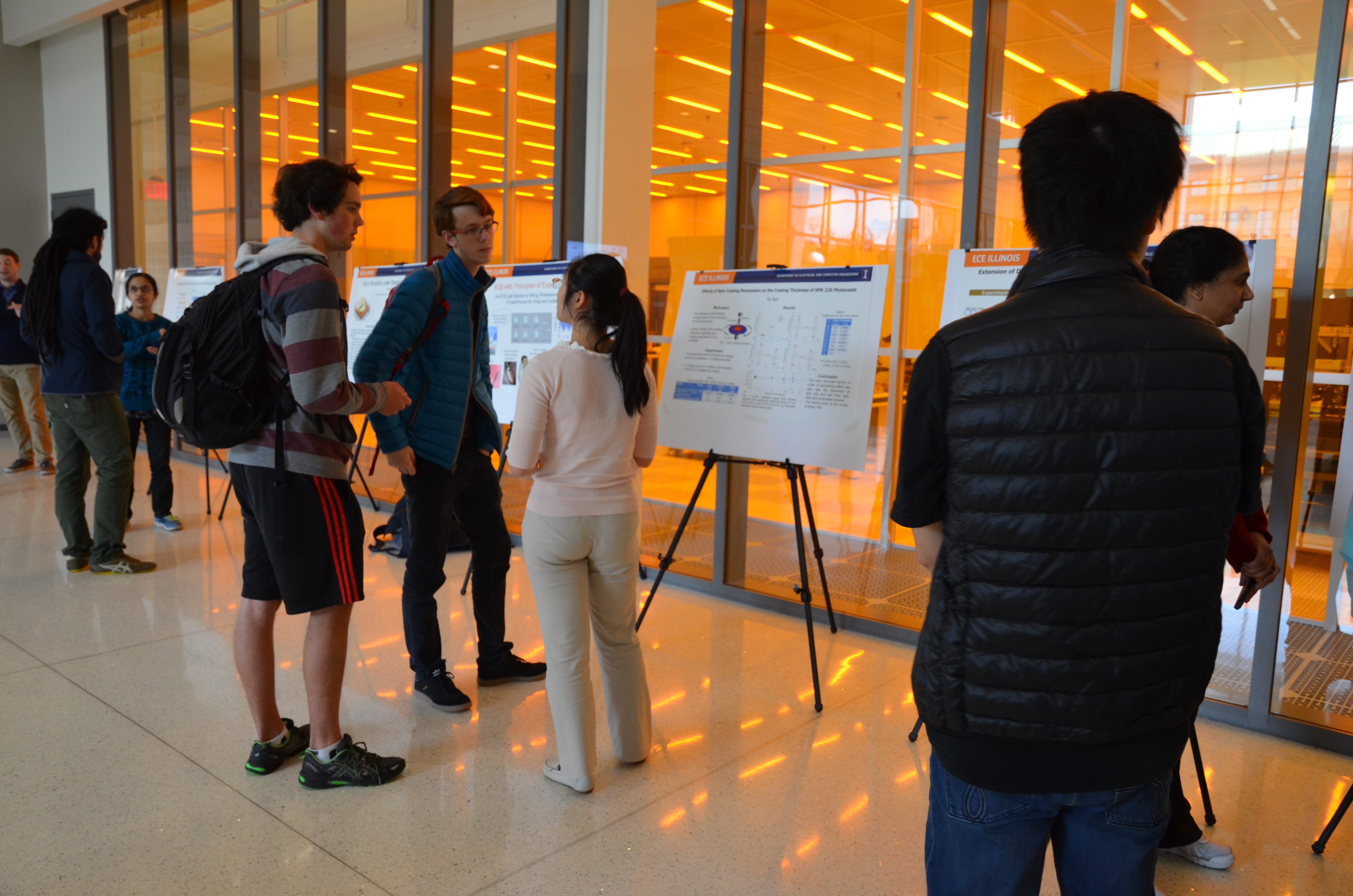 Students from ECE 446: Principles of Experimental Research presented their independent projects in a poster session in the ECEB atrium.