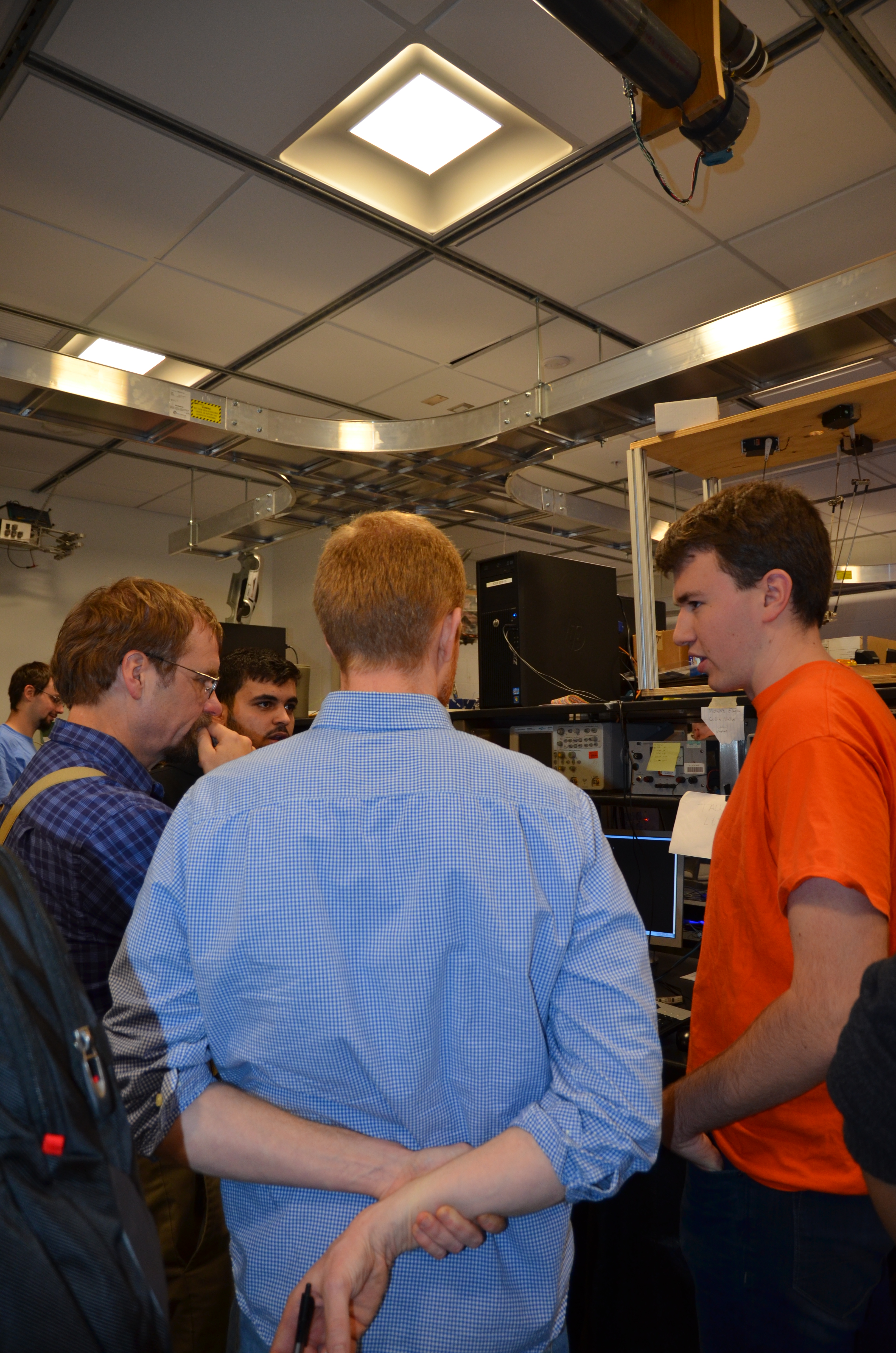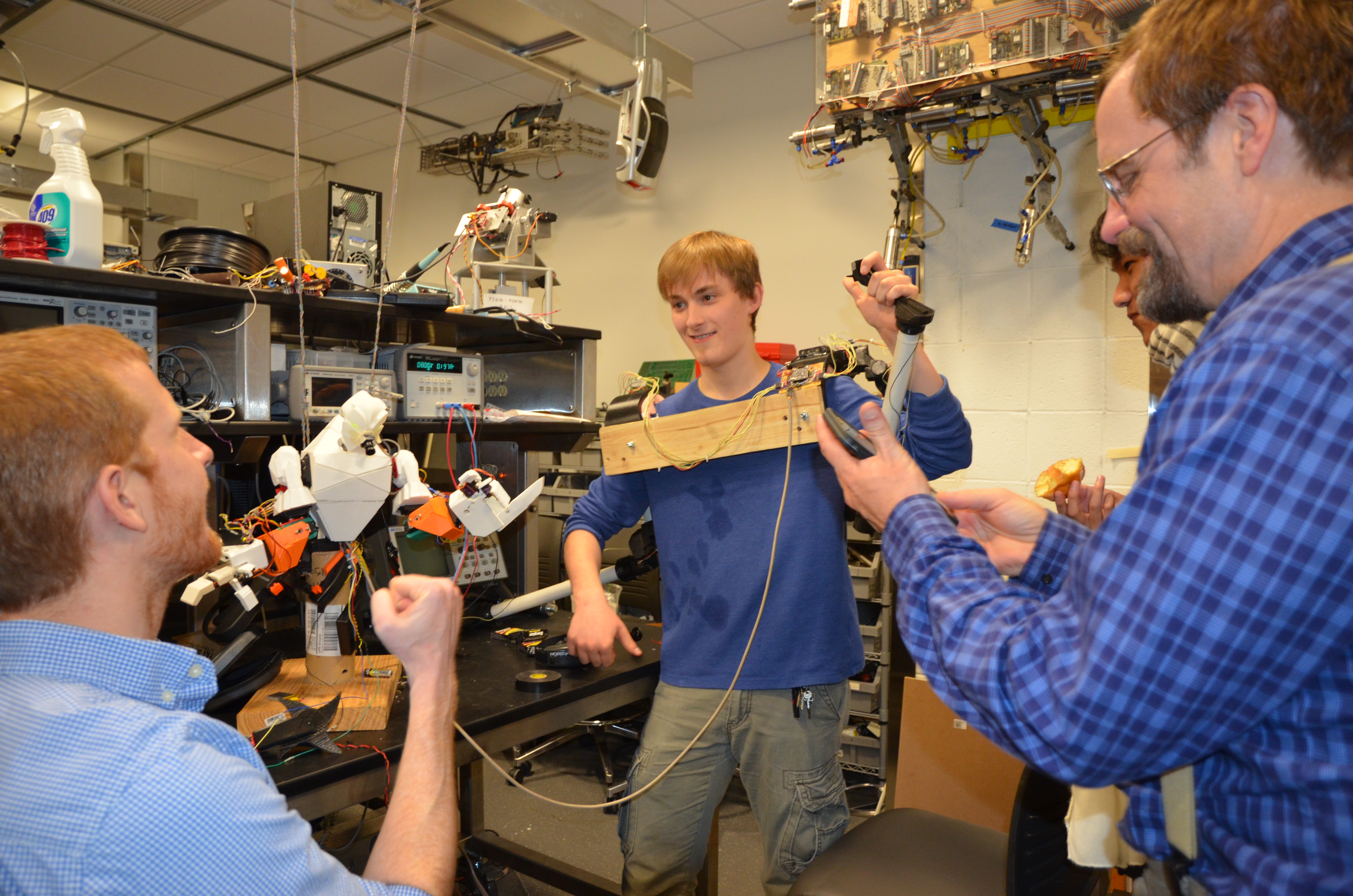 Jesse Cornman showing professors how his robot works.