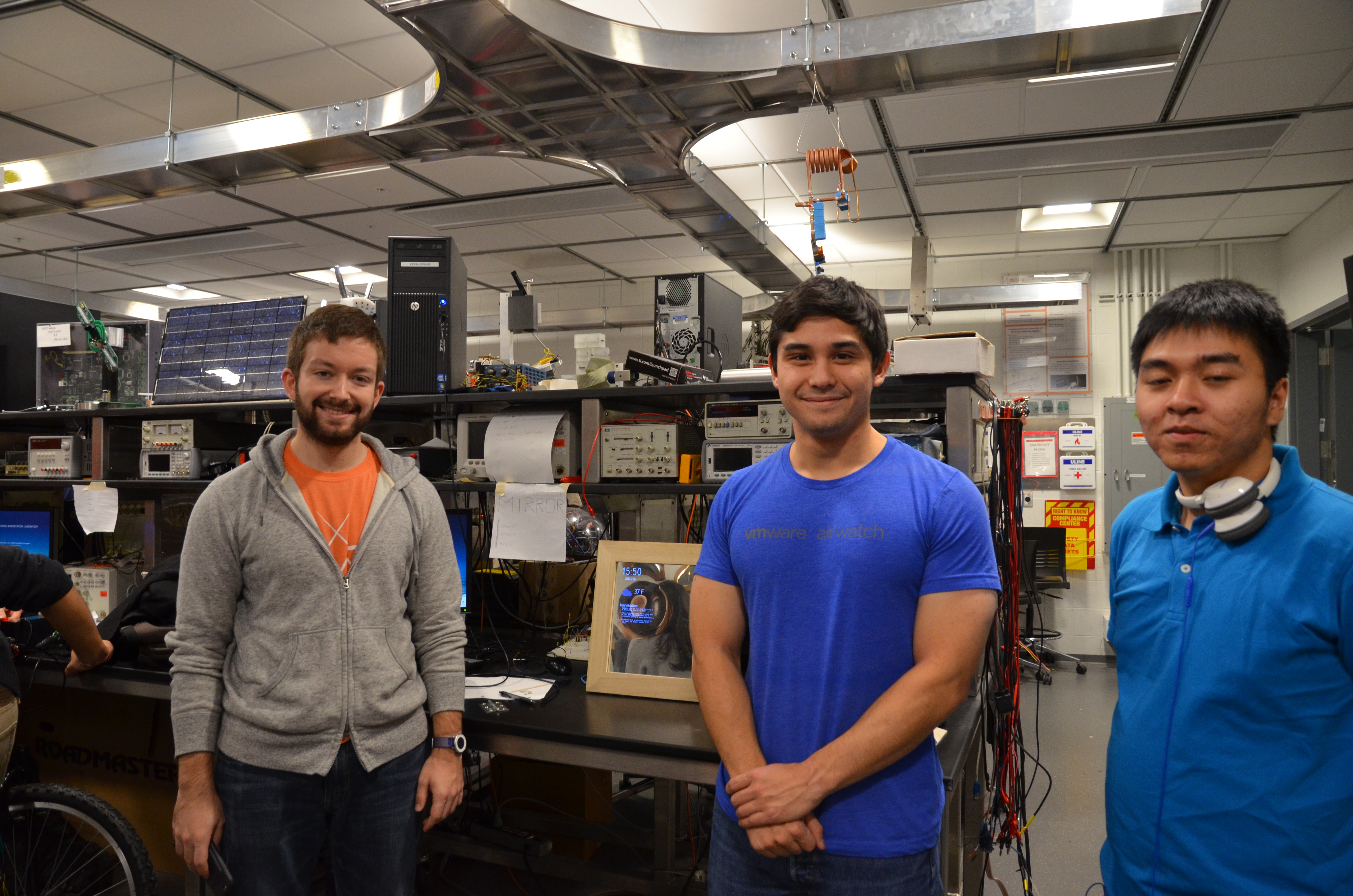 Vasil Pendavinji, Ben Moore, and Hung Le standing in front of their project the Smart Mirror.