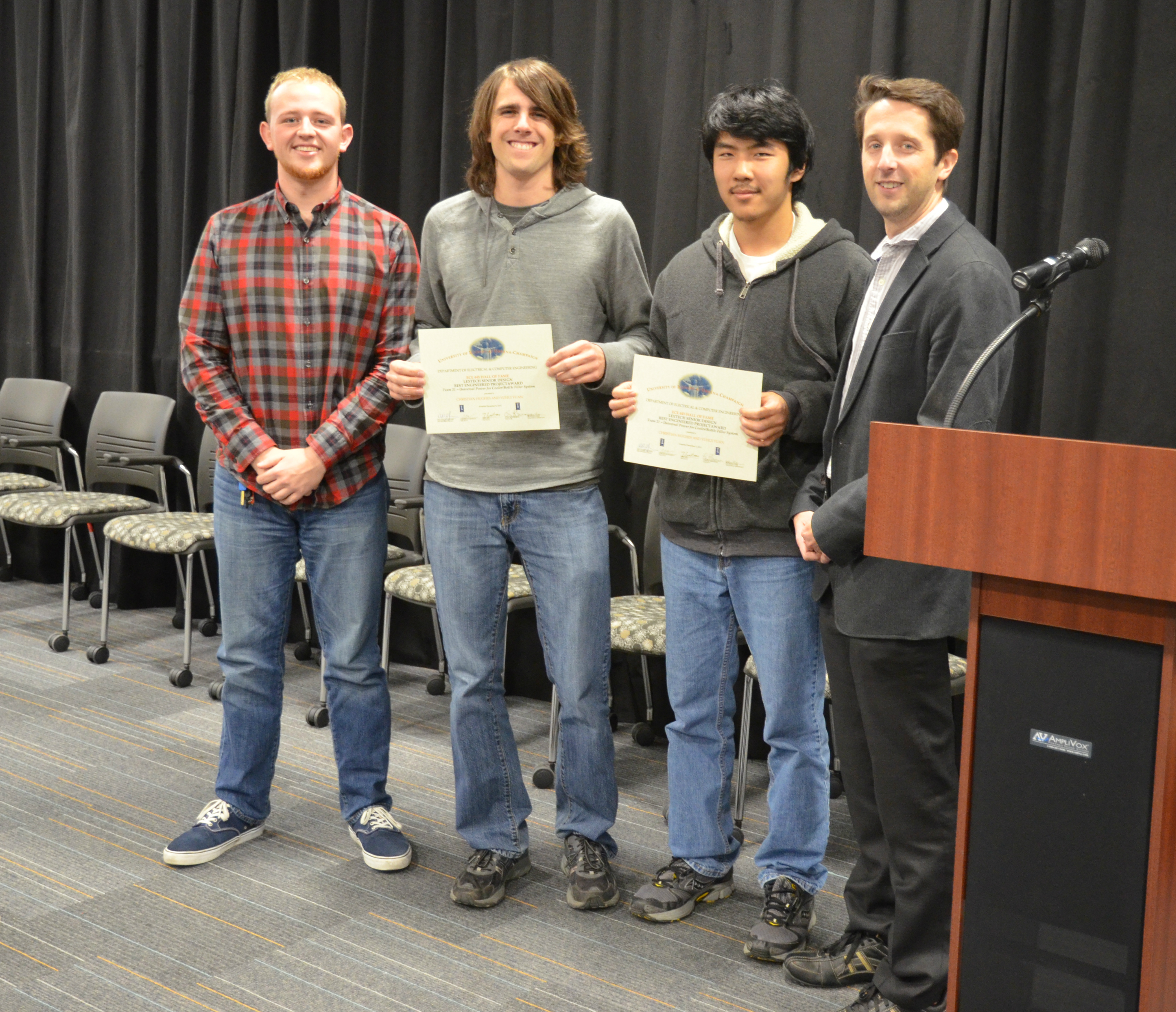 Team 21's project, 'Universal Power for Cooler/Bottle Filler System,' won the Lextech Senior Design Best Engineered Project Award. Team members: Christian Hughes and Yuhui Yuan. Also pictured: Jackson Lenz (TA) and Professor Makela.