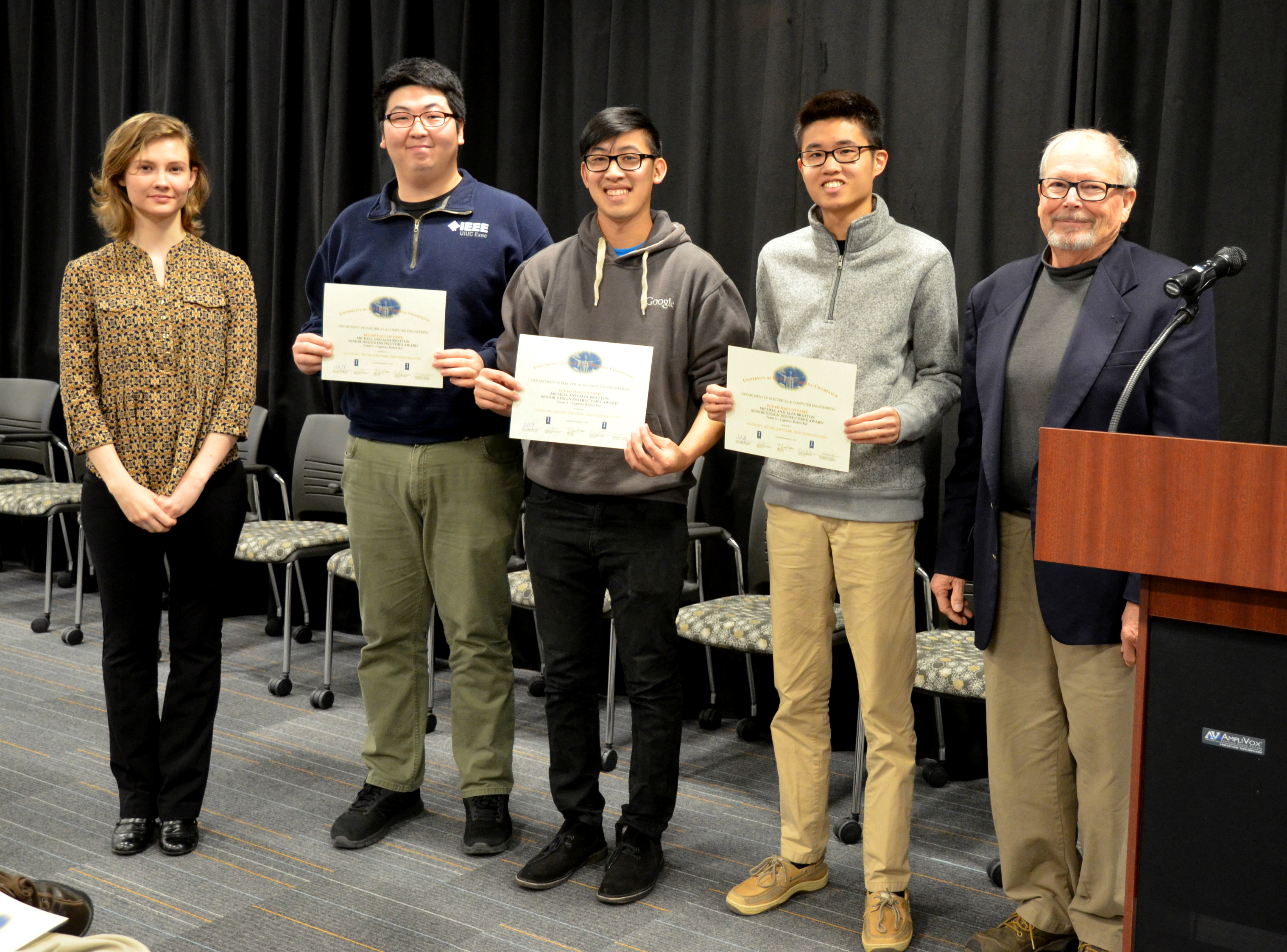 Team 5's 'Cypress Robot Kit' won the Michelle and Alex Bratton Senior Design Instructor's Award. Team members: Alvin Wu, Byung Joo Park, and Todd Nguyen. Also pictured: Katherine Kane (TA) and Professor Swenson.