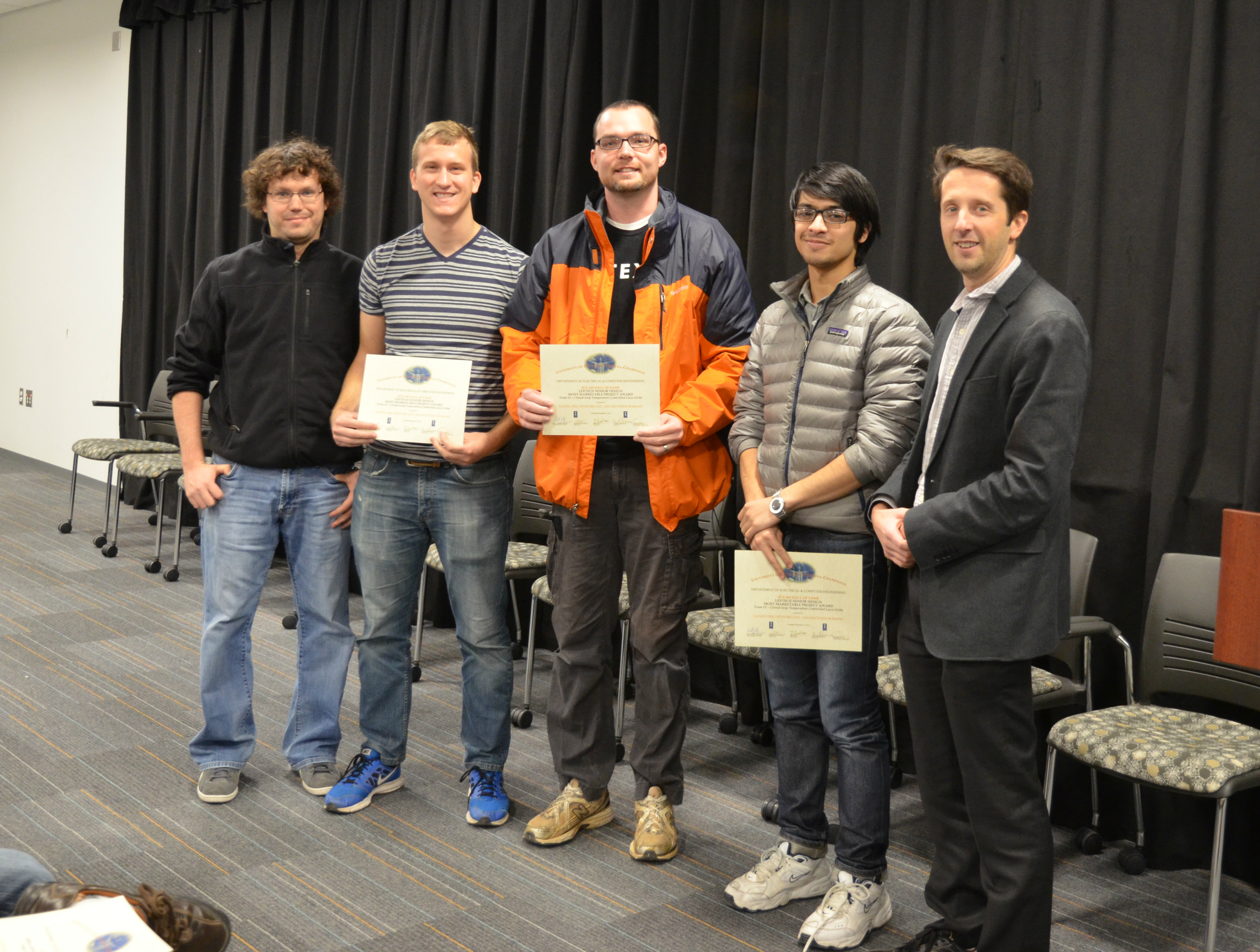 The Lextech Senior Design Most Marketable Project Award was presented to Team 13 for their 'Closed-loop Temperature Controlled Lava Globe.' Team members: Daniel Frei, Devin Bryant, and Matthew Romano. Also pictured: James Norton (TA) and Professor Makela.