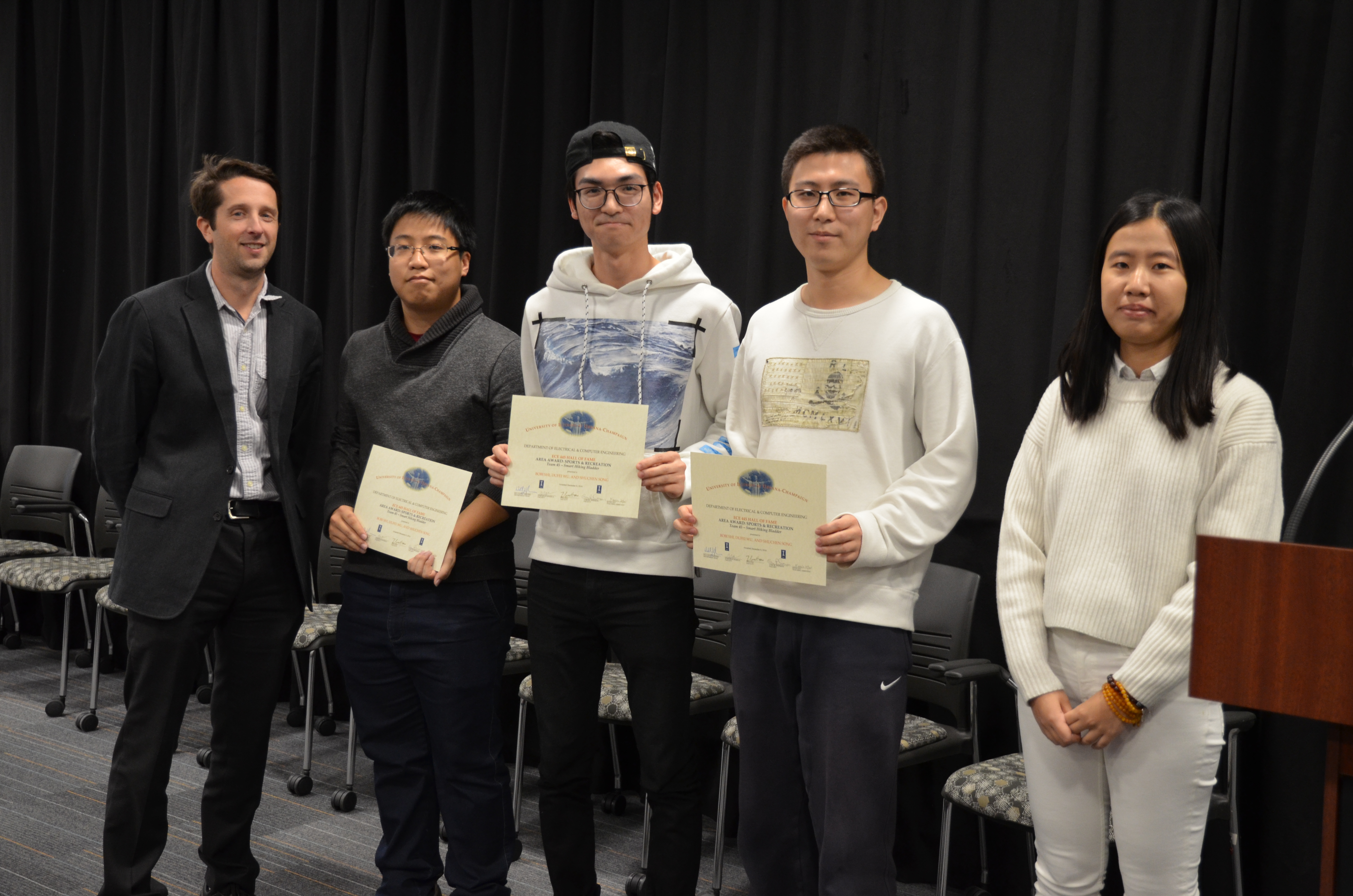 On December 8, students from ECE445: Senior Design Project Lab marked the end of their semester with an awards presentation. This course helps seniors make the transition into the industry through self-chosen team projects. Students have the opportunity to apply the skills and knowledge gained from previous courses and experiences, develop teamwork and leadership skills, and gain in-depth practical knowledge in a topic they are passionate about. The students receive guidance and support from faculty and TAs. Professors Jonathan Makela, Gary R Swenson, and Hao Zhu led the course this fall.