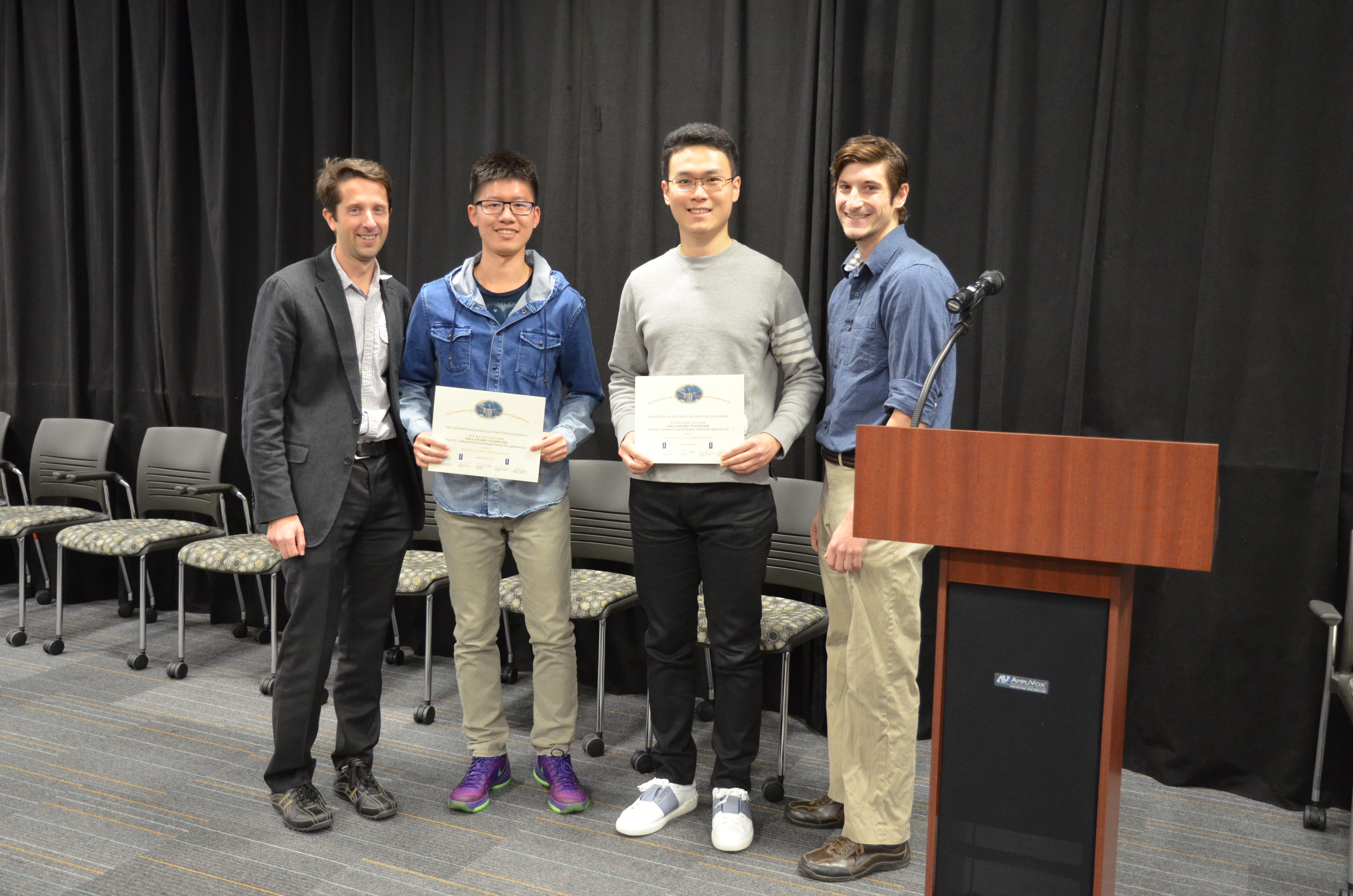 Team 11 won the Area Award for Teamwork for their design of 'Enhanced Security Rotary Pattern Recognition Lock.' Team members: Jingjing Li and Taiming Zhang. Also pictured: John Capozzo (TA) and Professor Makela.