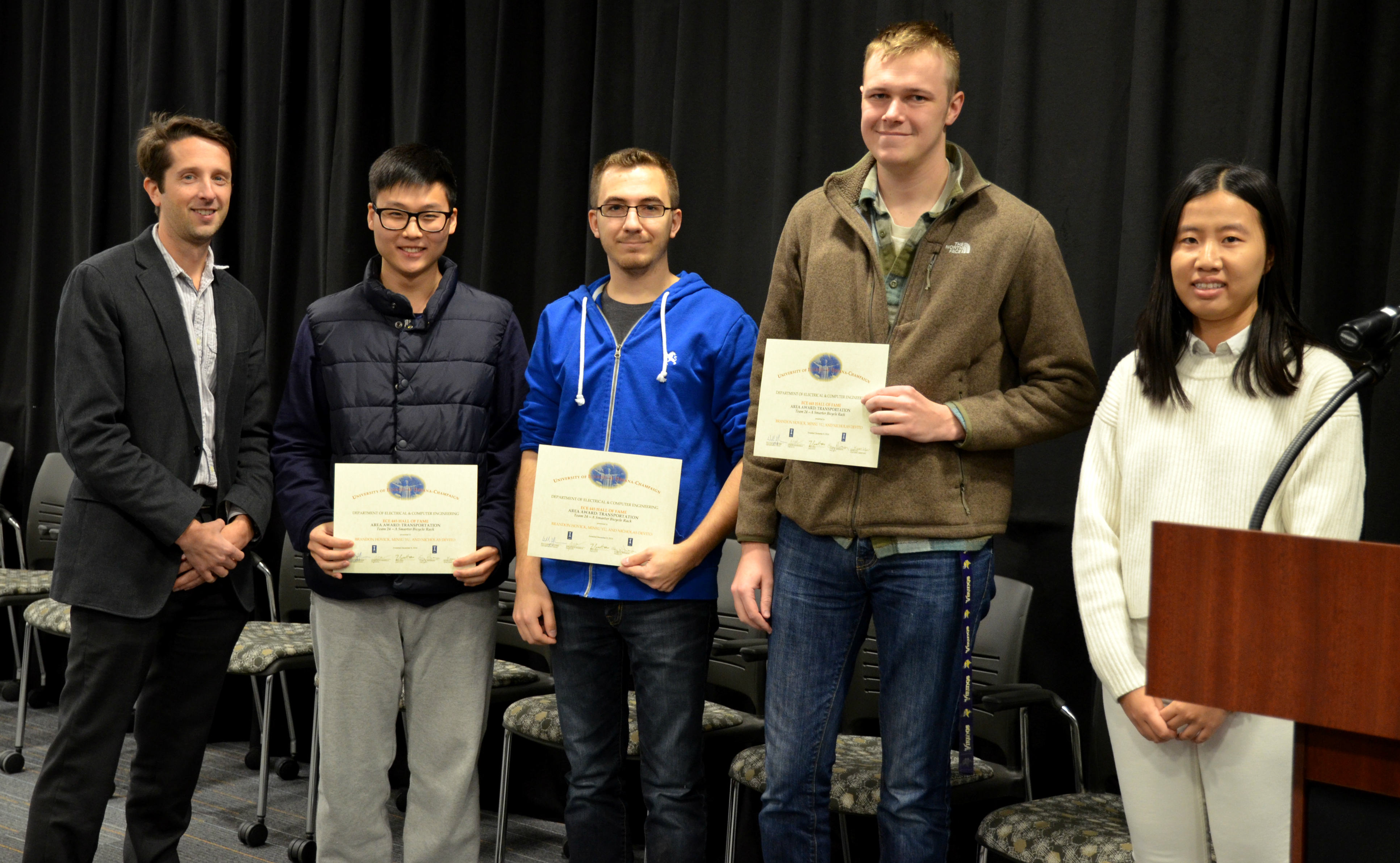 The Area Award for Transportation was awarded to Team 24 for 'A Smarter Bicycle Rack.' Team members: Brandon Hovick, Minsu Yu, and Nicholas Devito. Also pictured: Kexin Hui (TA) and Professor Makela.