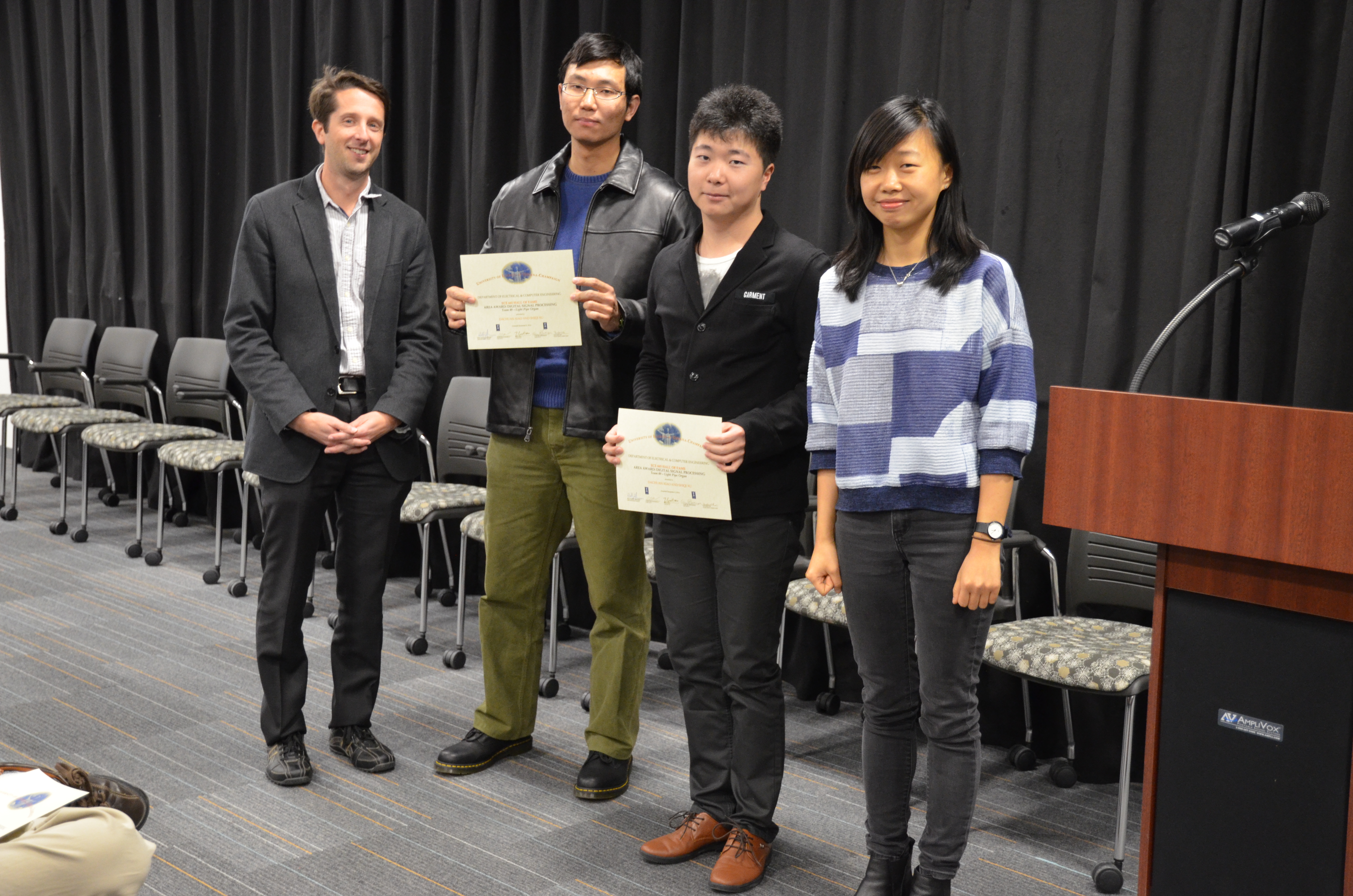 The Area Award for Digital Signal Processing is awarded to Team 49 for their 'Light Pipe Organ.' Team members: Dachuan Xiao and Shiqi Xu. Also pictured: Yuchen He (TA) and Professor Makela.
