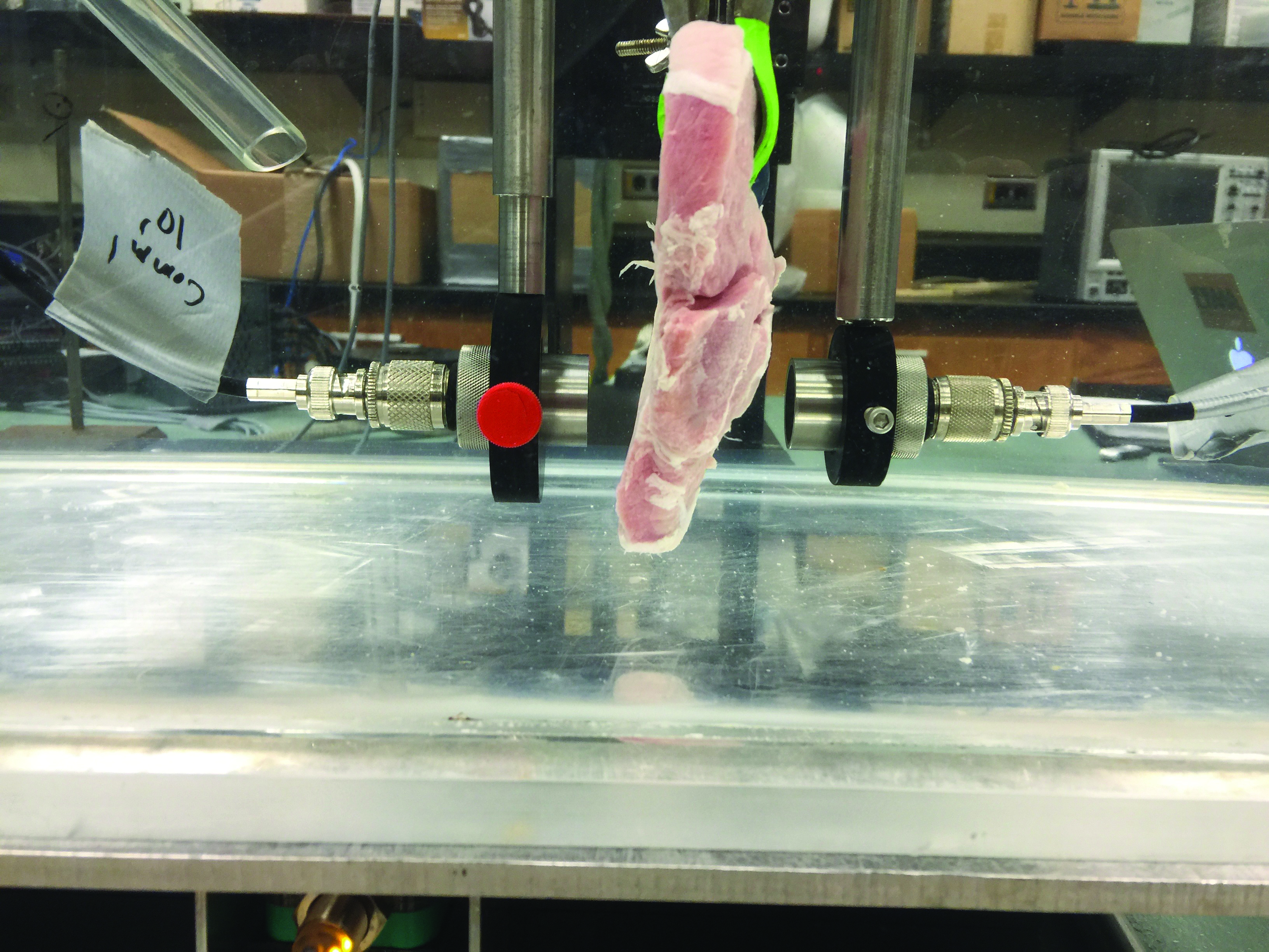 So Oelze and Singer, along with graduate student Anthony S Podkowa, suspended beef liver and a pork chop in a tank of degassed water (to protect the transducers). Their system has been fittingly named MEAT-COMMS, or Mbps Experimental Acoustic Through-Tissue Communication.