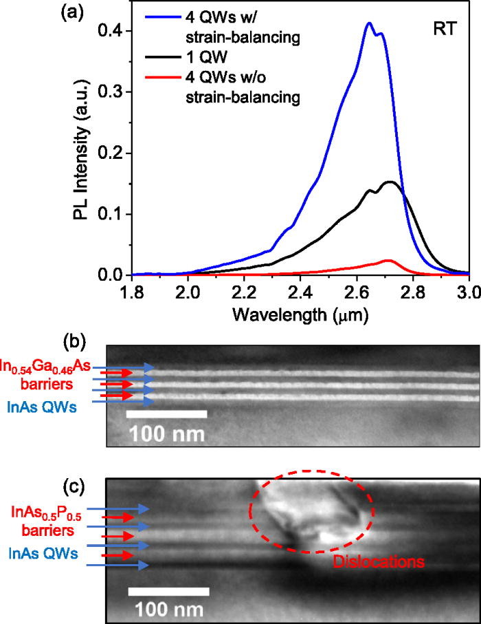 ECE ILLINOIS Associate Professor Minjoo Lawrence Lee and a team of researchers have demonstrated the first room-temperature lattice-mismatched indium arsenide (InAs) quantum-well laser grown on an indium phosphide (InP) substrate. Their laser emits light at a wavelength (2.75µm) that is typically only achievable using the more expensive substrate gallium antimonide (GaSb).