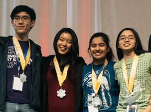From left, freshmen Duke Vijitbenjaronk, Jennifer He, Aria Malkani, and Shao Yie.ECE ILLINOIS freshman Duke Vijitbenjaronk and CS freshmen, Jennifer He, Arshia “Aria” Malkani, and Shao Yie Soh, brought home two prizes at the BoilerMake IV a 35-hour hackathon at Purdue University, including "Make School’s Best Beginner Hack” and “Rockwell Collins’ Best Rookie Hack."