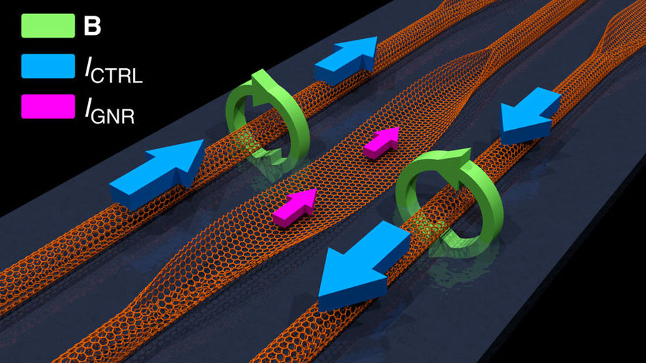 In the team’s spintronic circuit design, electrons moving through carbon nanotubes—essentially tiny wires composed of carbon—create a magnetic field that affects the flow of current in a nearby graphene nanoribbon, providing cascaded logic gates that are not physically connected.