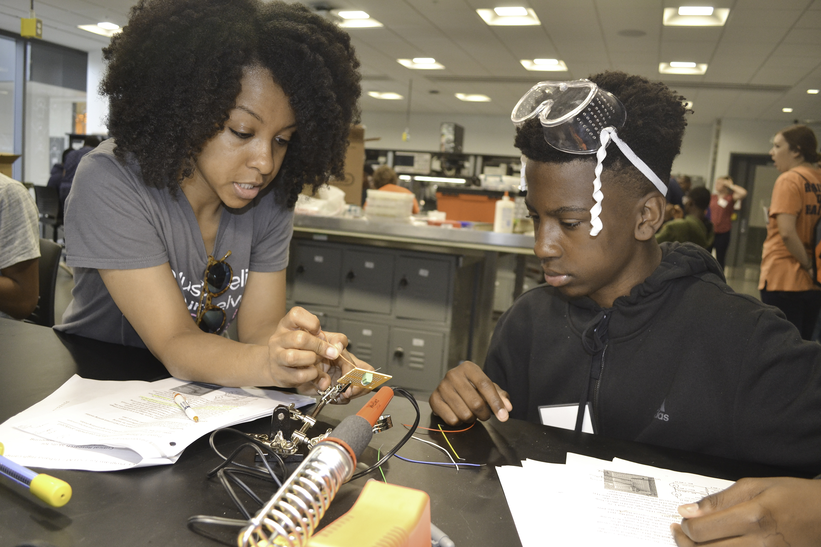 Lonna Edwards helps a camper build a circuit during the 2017 I-STEM Multidisciplinary Summer Camp.Each year, the Celebrating Diversity, Recognizing Excellence (CDRE) event recognizes graduating Summer Predoctoral Institute (SPI) fellows, fellowship recipients, and students for their scholarly work, teaching, and service.