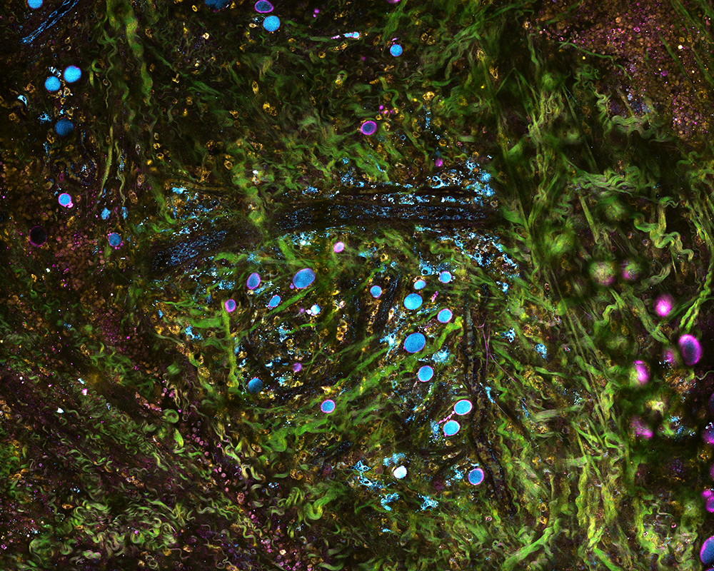The researchers saw that the cells near the tumor had differences in metabolism and morphology, indicating that the cells had been recruited by the cancer. In addition, they observed surrounding tissues creating infrastructure to support the tumor, such as collagen and blood vessels. They also saw communication between the tumor cells and the surrounding cells in the form of vesicles, tiny transport packages released by cells and absorbed by other cells.