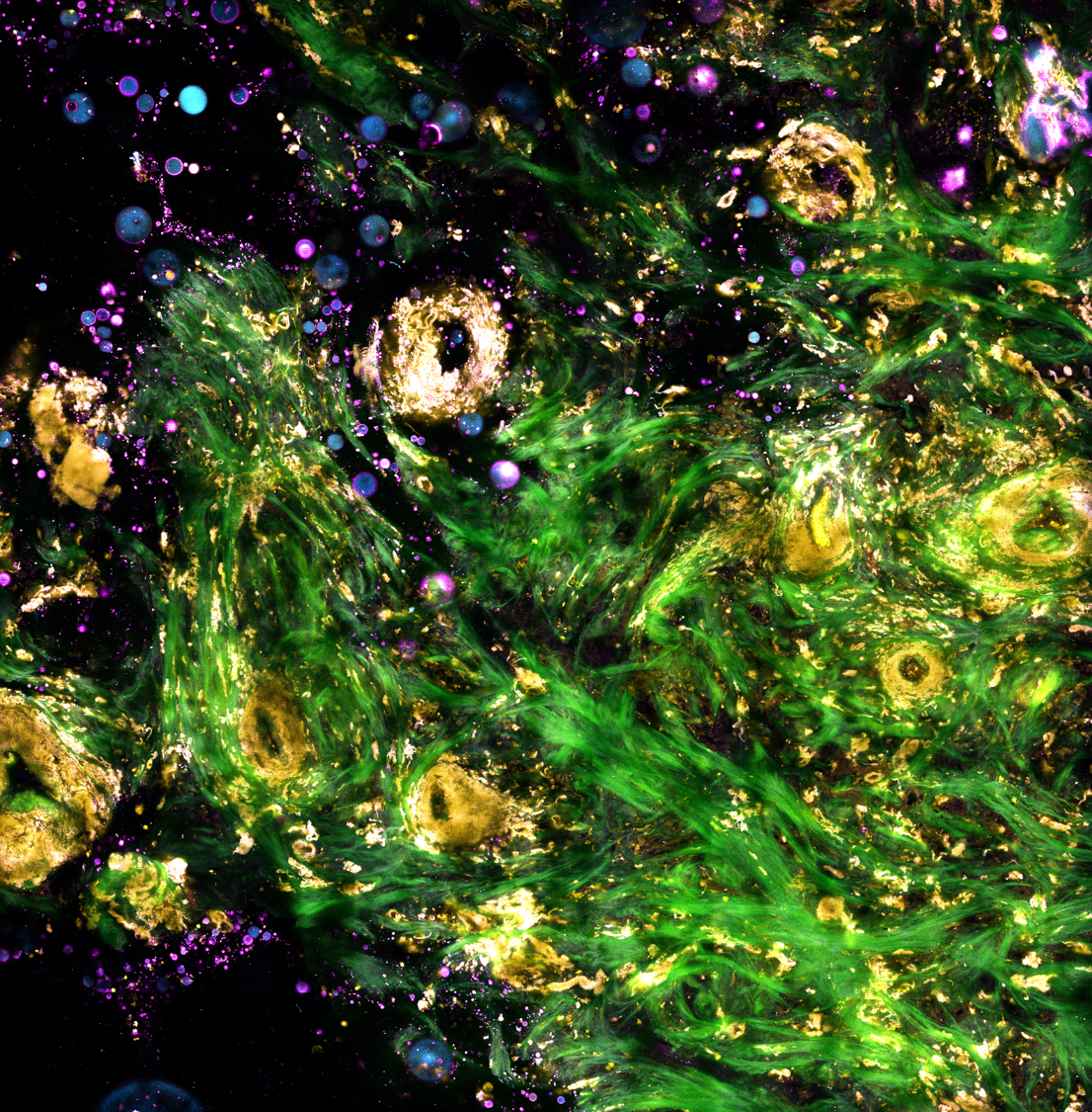 Boppart's portable optical imaging system uses precise light pulses to simultaneously image tissue in four modalities, enabling his team to study concurrent processes within cells and tissue that make up the tumor microenvironment. For example, collagen fibers appear in green; elastin fibers and flavin adenine dinucleotide-containing cell cytoplasm appear in yellow; cell membranes, lipid boundaries, and extracellular vesicles (EVs) appear in magenta; and nicotinamide adenine dinucleotide in the cells and lipids appears in cyan.