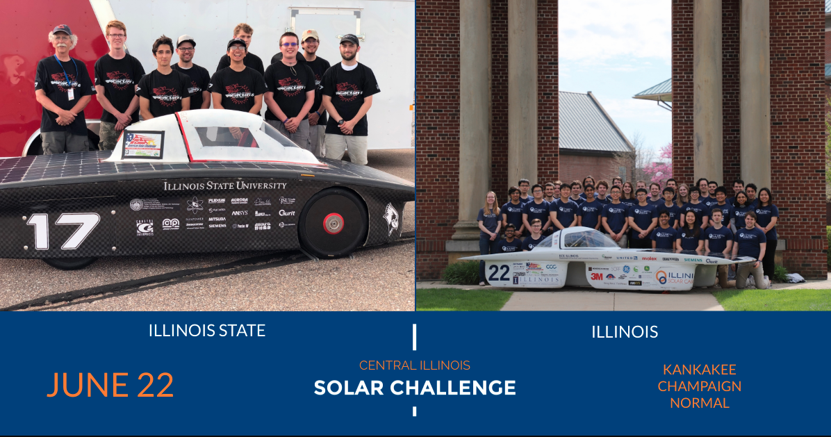 The Illini and ISU Solar Car teamsOn June 22nd, the Illini Solar Car team and Illinois State University Solar Car Team will be putting on a mock solar challenge in preparation for the Formula Sun Grand Prix in July. Starting in Kankakee, IL the teams will travel to Normal, IL and pass through a checkpoint in Champaign!