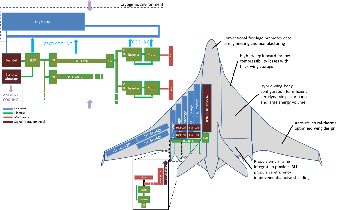 “Essentially, the program focuses on the development of a fully electric aircraft platform that uses cryogenic liquid hydrogen as an energy storage method,” said Phillip Ansell, assistant professor in the Department of Aerospace Engineering at Urbana-Champaign and principal investigator for the project. “The hydrogen chemical energy is converted to electrical energy through a series of fuel cells, which drive the ultra-efficient electric propulsion system. The low-temperature requirements of the hydrogen system also provide opportunities to use superconducting, or lossless, energy transmission and high-power motor systems.
