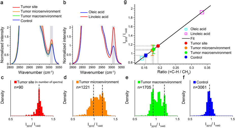 Fatty acids play essential roles in the growth and metastasis of cancer cells. Cancer cells alter the fatty acid synthesis and metabolism intracellularly and in the macroenvironment. Bopart’s team reported an increase in the production of polyunsaturated fatty acids (PUFAs) was identified using Raman micro-spectroscopy in both cancerous and normal appearing breast tissue obtained from breast cancer patients and tumor-bearing rats.