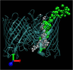 These BioMOCA simulations are an example of the cumulative volume occupied by the trajectories of positively charged potassium (green) and negatively charged chlorine (gray) ions. Due to the strong pore charge the ions follow well separated paths with a corkscrew shape, which is consistent with molecular dynamics results.
