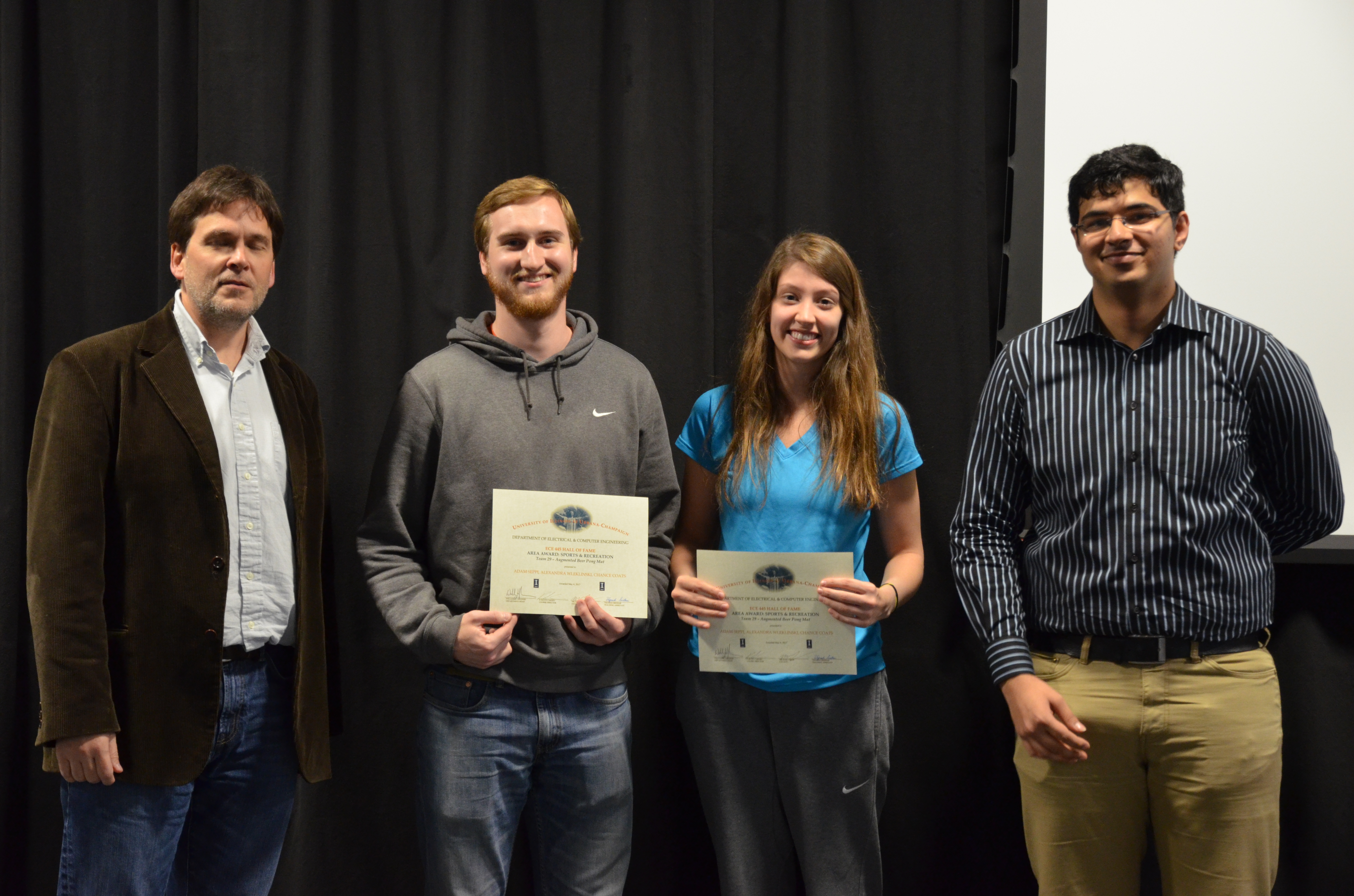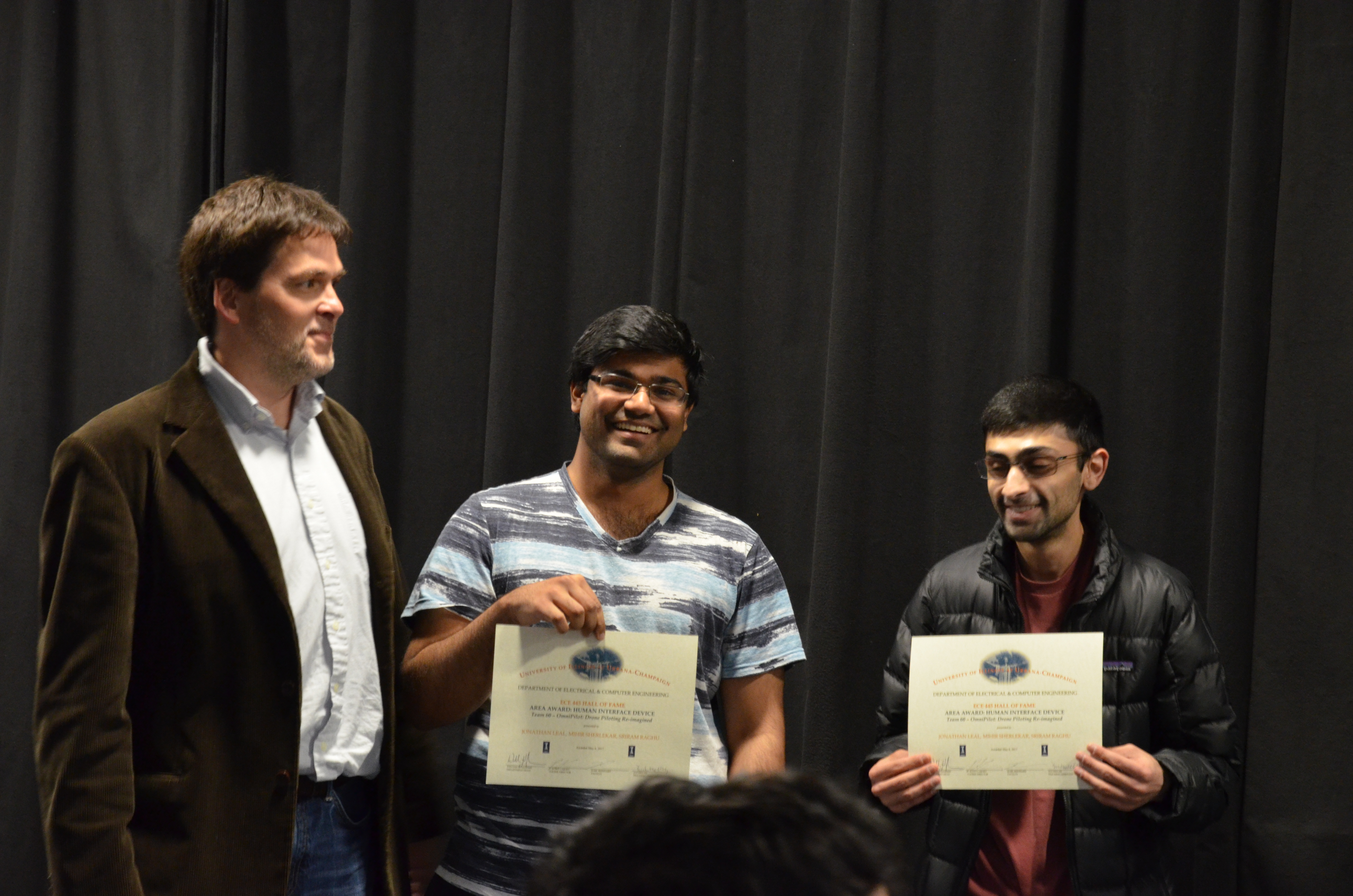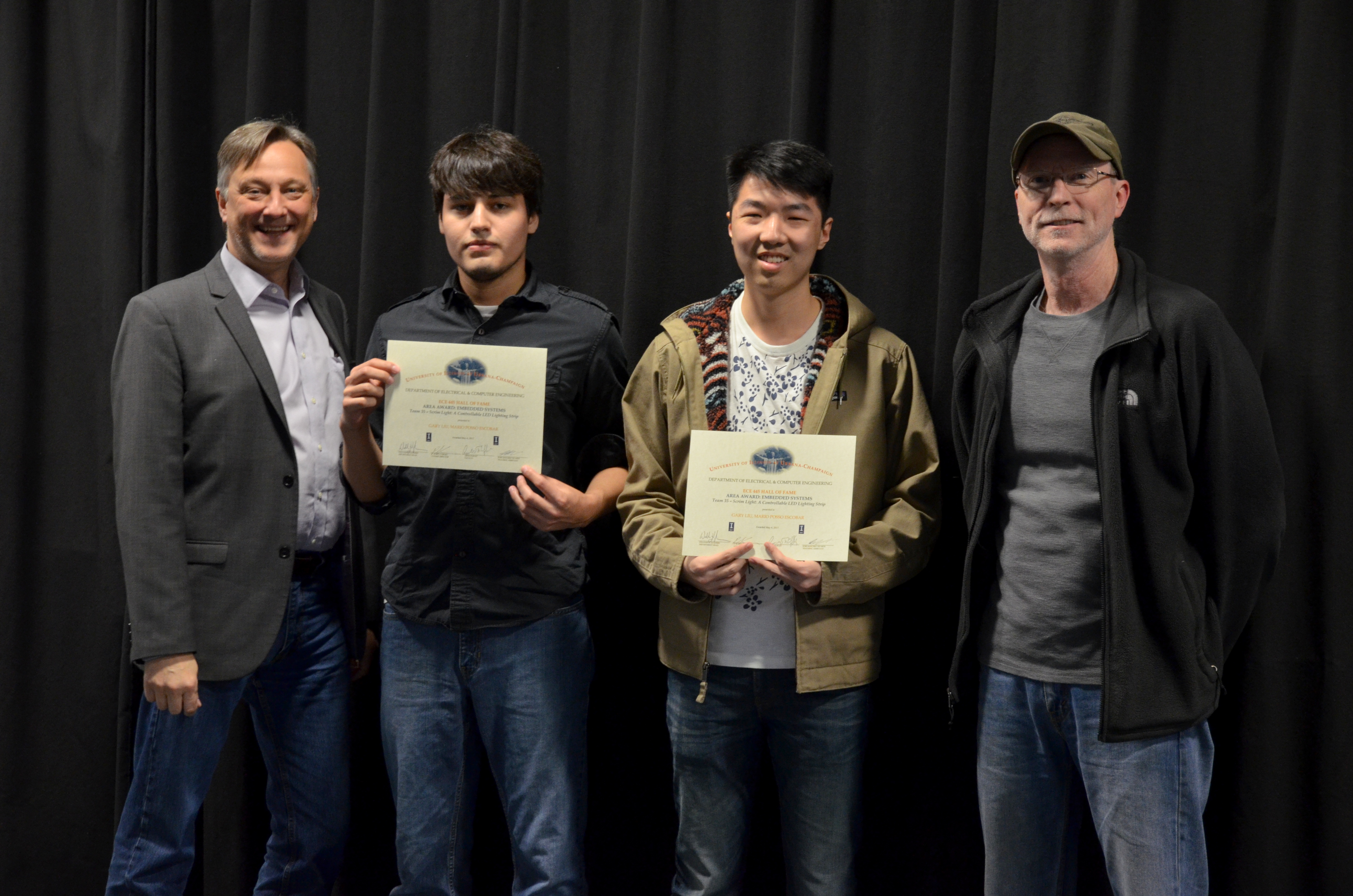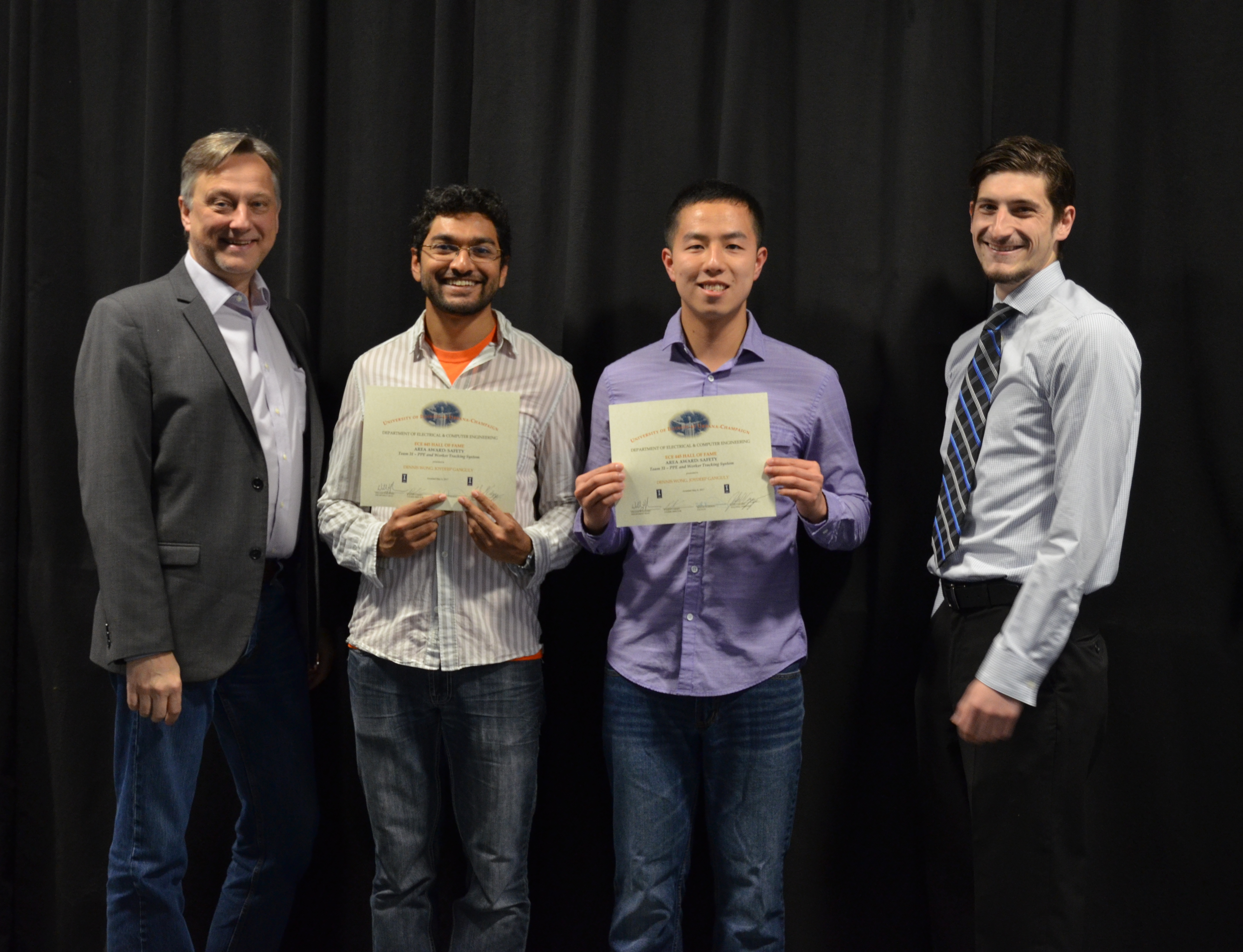 The ECE445 - Senior Design Project Lab marked the end of the semester with an awards presentation. The course helps seniors make the transition into the industry through self-chosen team projects. Students have the opportunity to apply the skills and knowledge gained from previous courses and experiences, develop teamwork and leadership skills, and gain in-depth practical knowledge in a topic they are passionate about. The students receive guidance and support from faculty and TAs. Professors Paul Scott Carney, Arne Woolsey Fliflet, Seth Andrew Hutchinson, Michael L Oelze and Karl Edward Reinhard led the lab in Spring 2017.