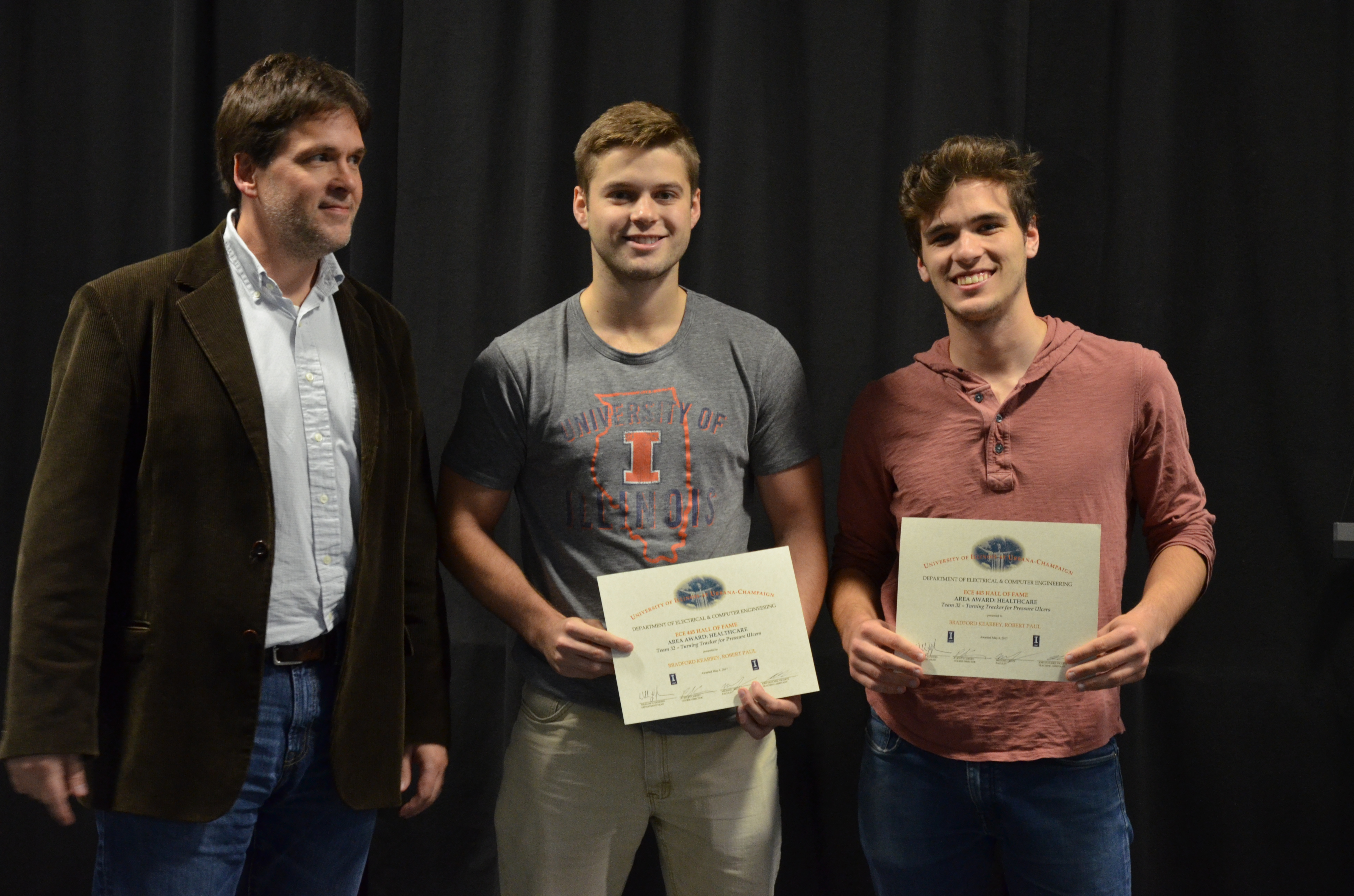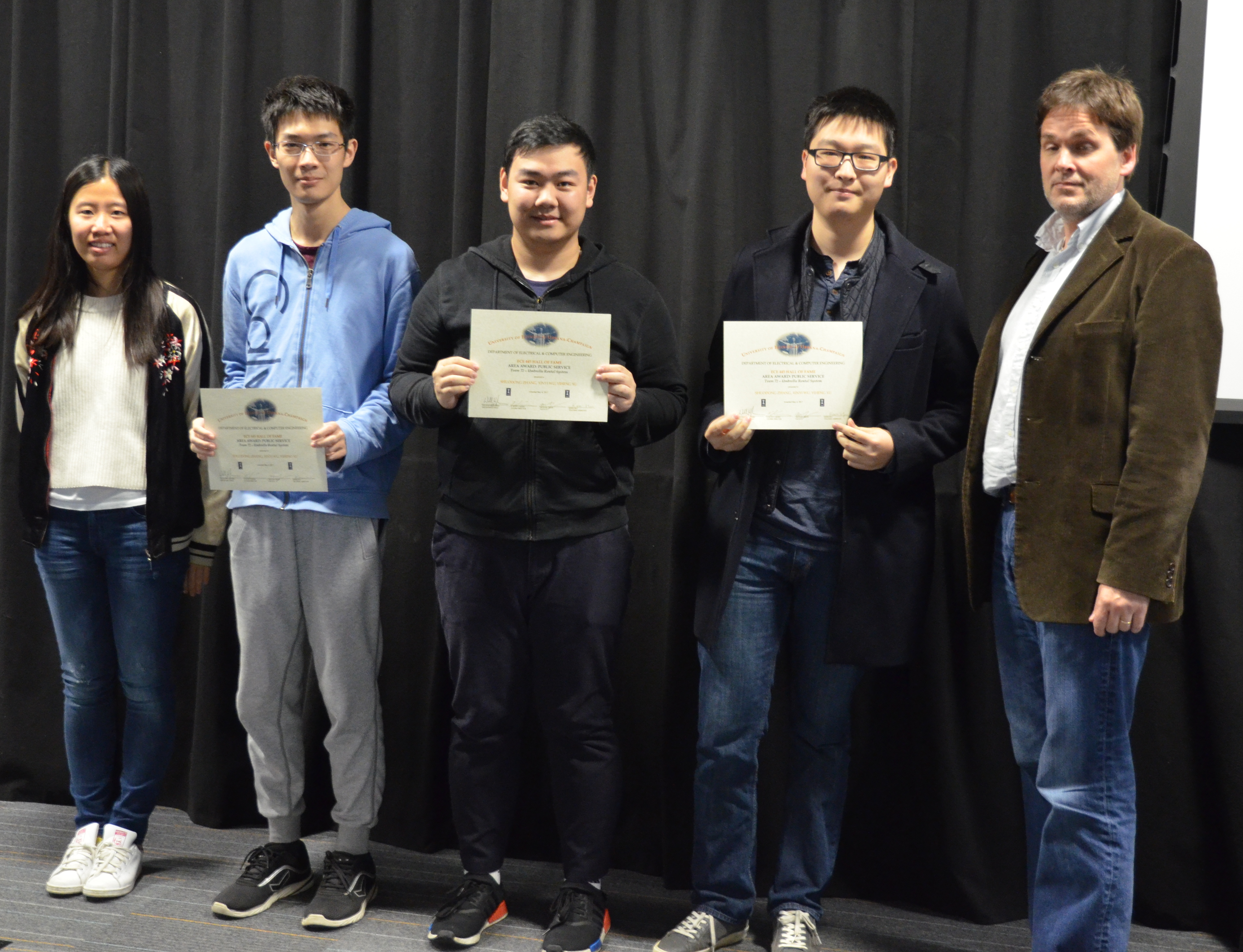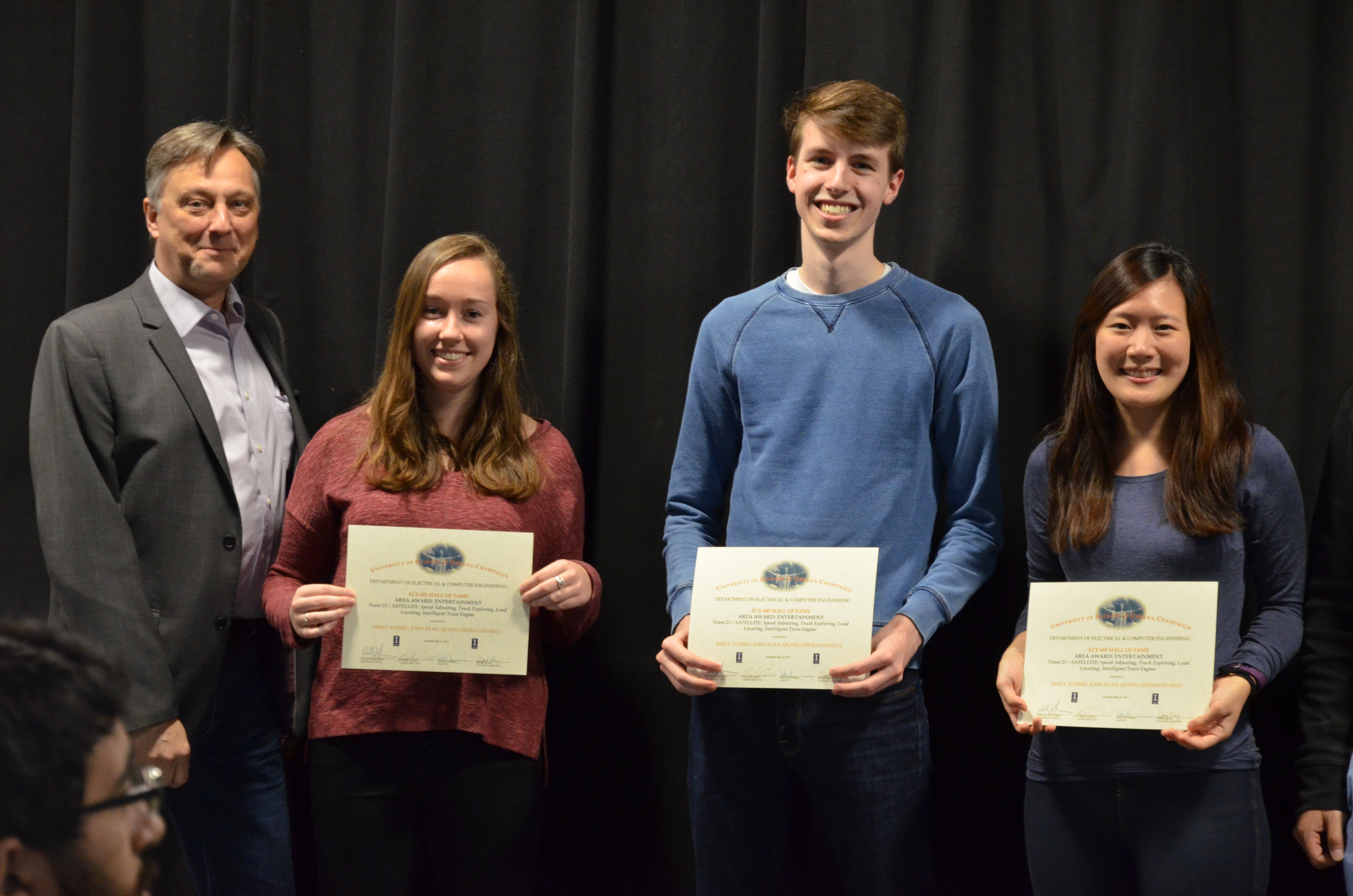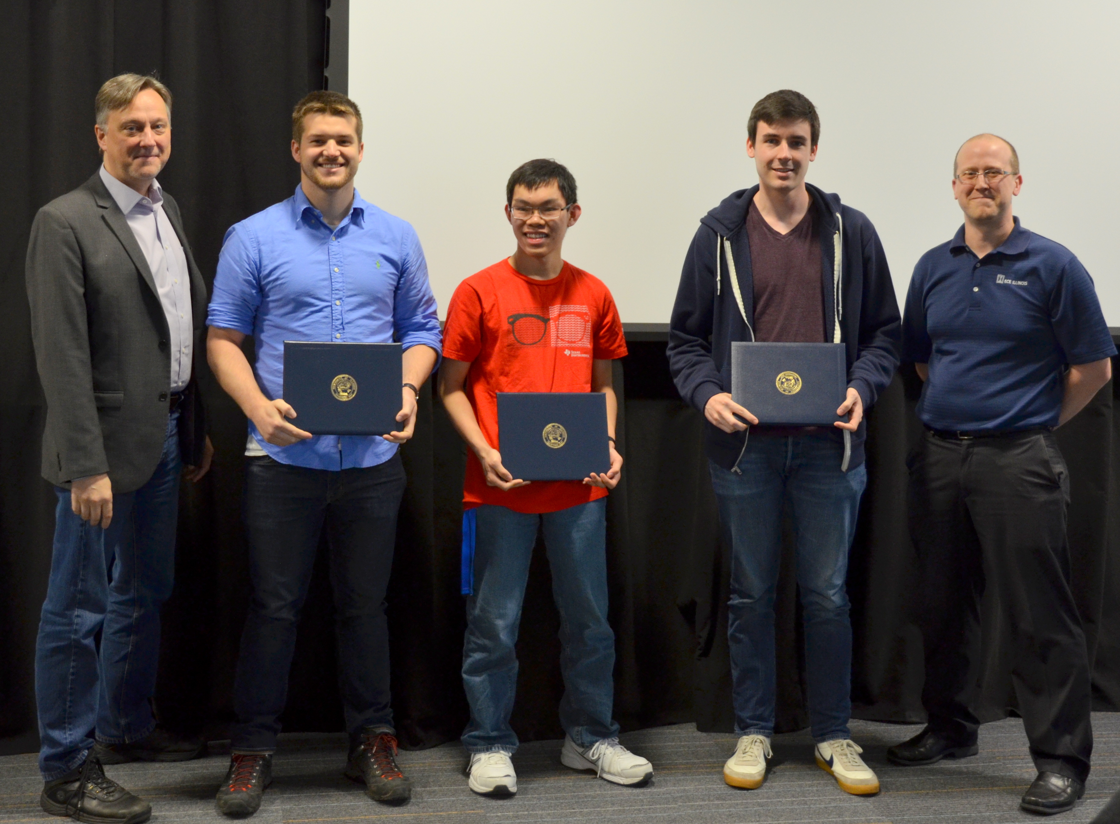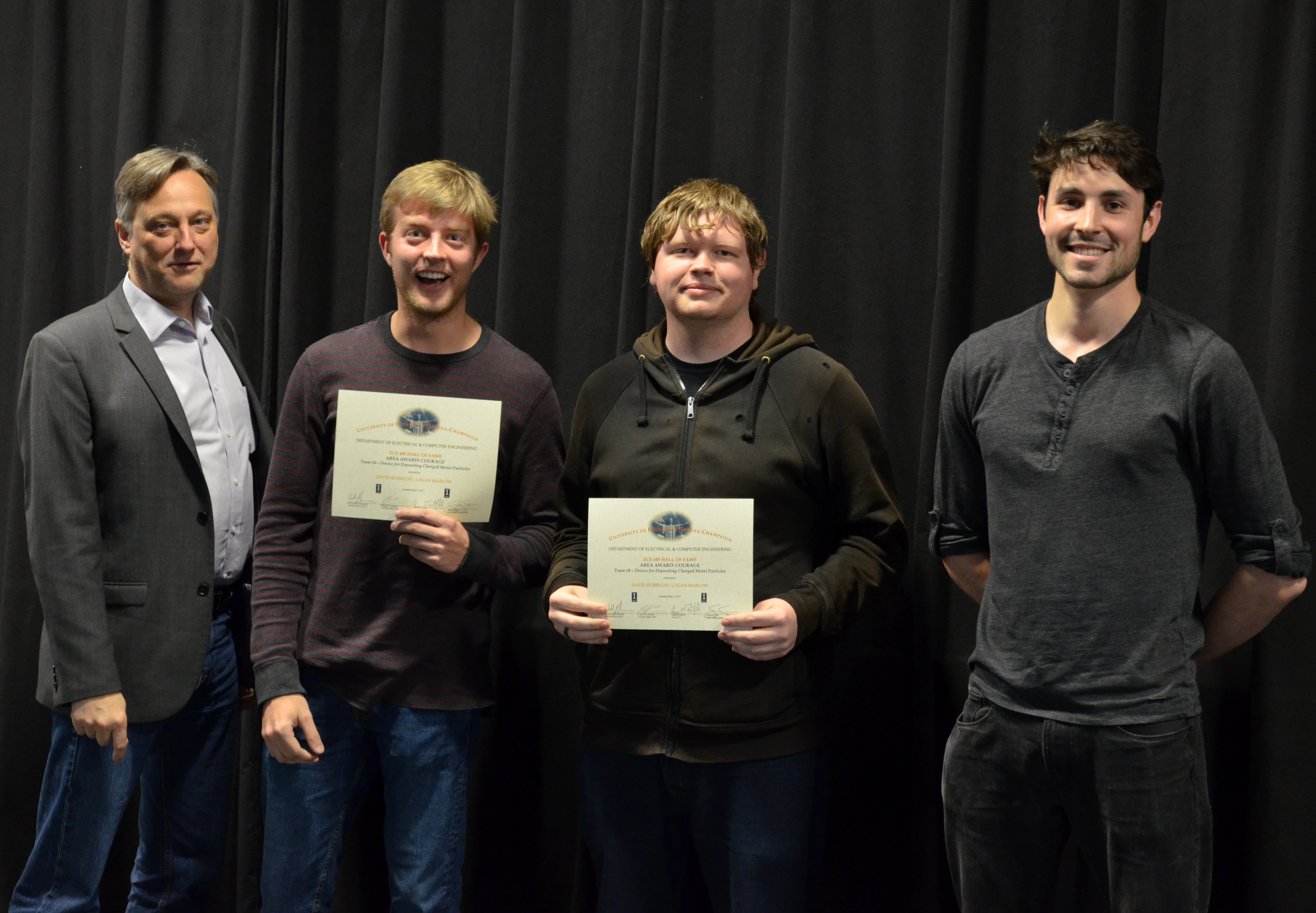 The ECE445 - Senior Design Project Lab marked the end of the semester with an awards presentation. The course helps seniors make the transition into the industry through self-chosen team projects. Students have the opportunity to apply the skills and knowledge gained from previous courses and experiences, develop teamwork and leadership skills, and gain in-depth practical knowledge in a topic they are passionate about. The students receive guidance and support from faculty and TAs. Professors Paul Scott Carney, Arne Woolsey Fliflet, Seth Andrew Hutchinson, Michael L Oelze and Karl Edward Reinhard led the lab in Spring 2017.